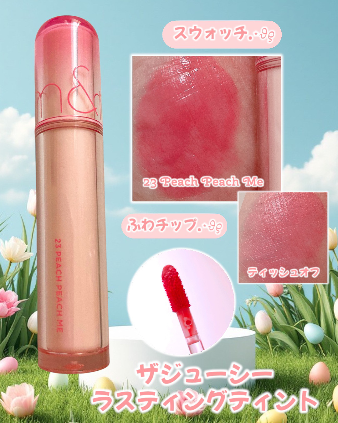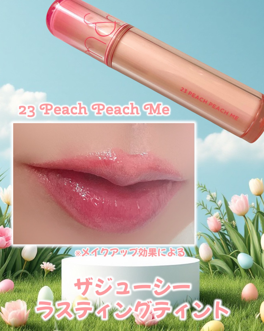 .#PR#ロムアンド新作のシングルアイシャドウに合わせたらめちゃめちゃ可愛かったリニューアル発売したザジューシーラスティングティント💄23番はたまらなく可愛いブルベにおすすめピーチピンク🍑全体に薄く塗ってその後内側に重ね塗り🪞簡単にグラデーシ...