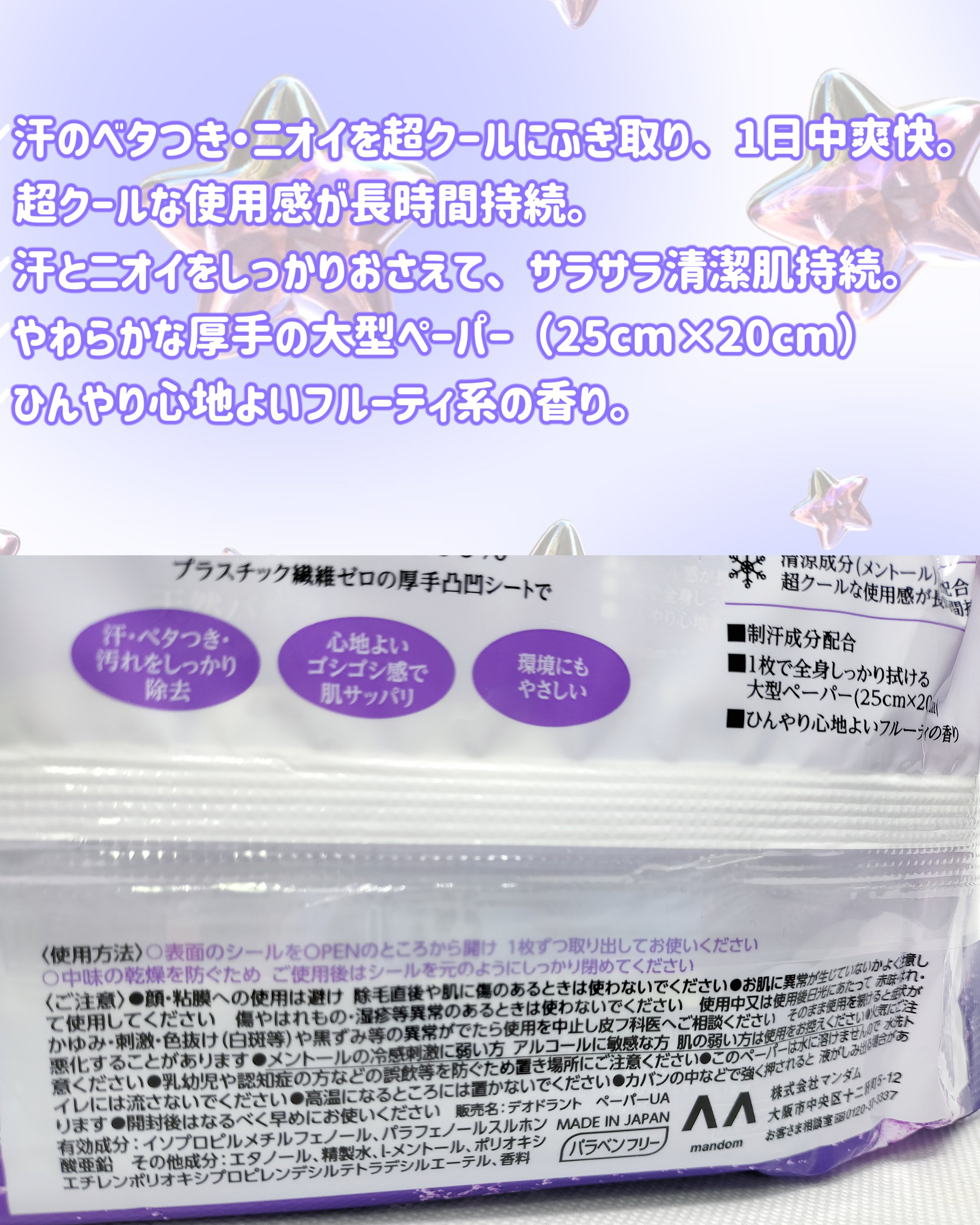 | ボディシートランキング第8位 | 汗が滝みたいに出てる時に使うと冬?!ってくらい涼しくなります! | 詳細を見る | |