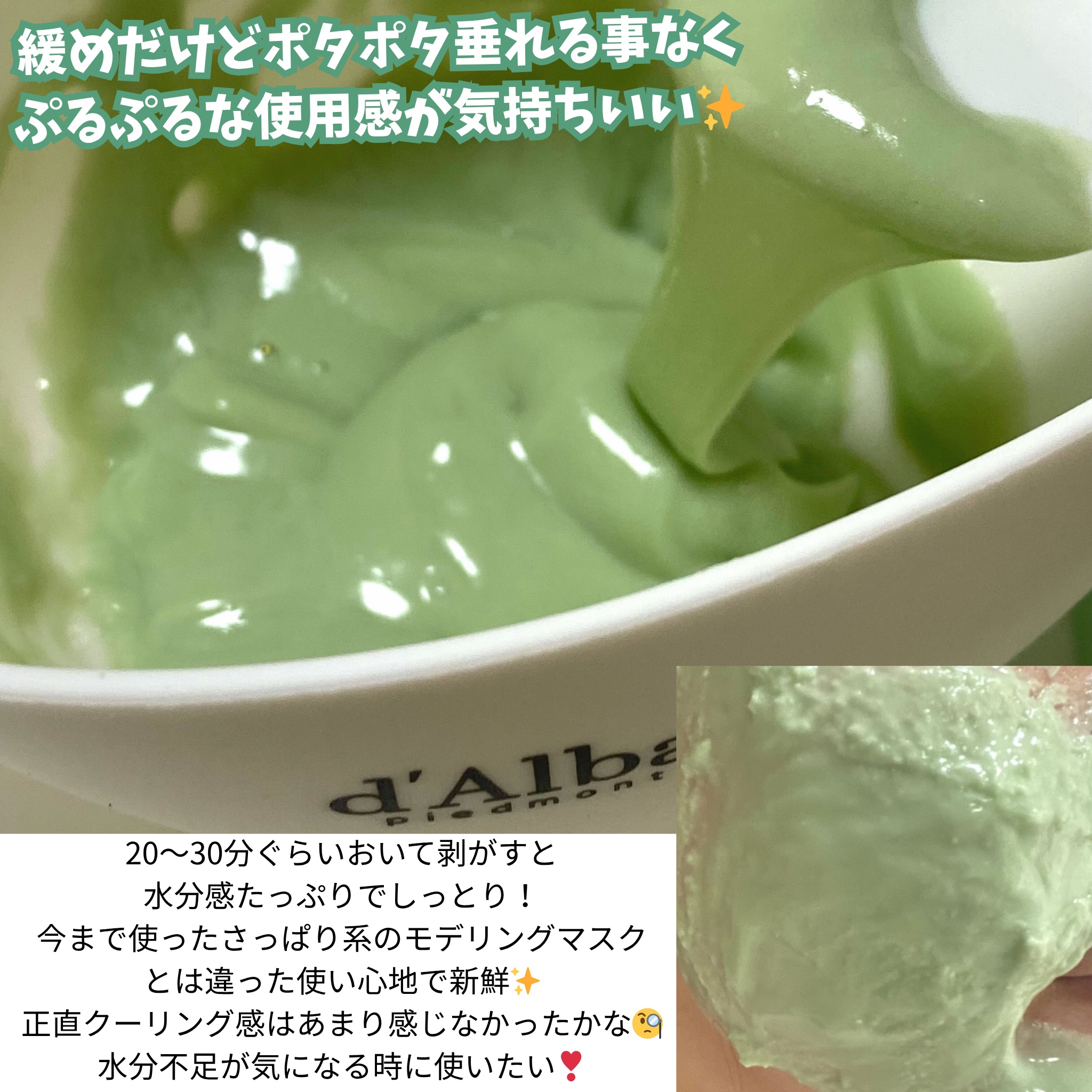 自宅で手軽にモデリングマスクができることが嬉しい♪ ダルバのモデリングマスクは粉ではなく2種類の液剤を合わせるだけ! オイルセラムにはダルバお馴染みのホワイトトリュフ*が配合されているそうですよ。 ぷるぷるになったマスクはぺろんと剥がしやすく剥がすのが楽しい!