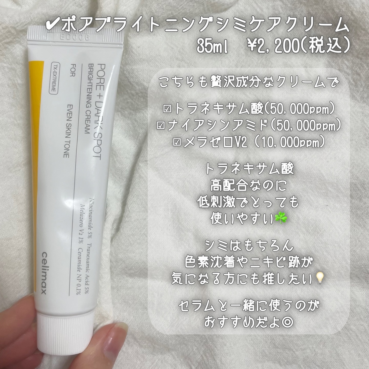 ♚celimaxポアブライトニングシミケアセラム/ポアブライトニングシミケアクリーム♚コンシーラーなしでもカバーしたかのような美肌に?!メラニン色素への3段アプローチ‼️トリプル阻害‼️◆トラネキサム酸→メラニンの生成司令を阻害◆ナイアシンア...