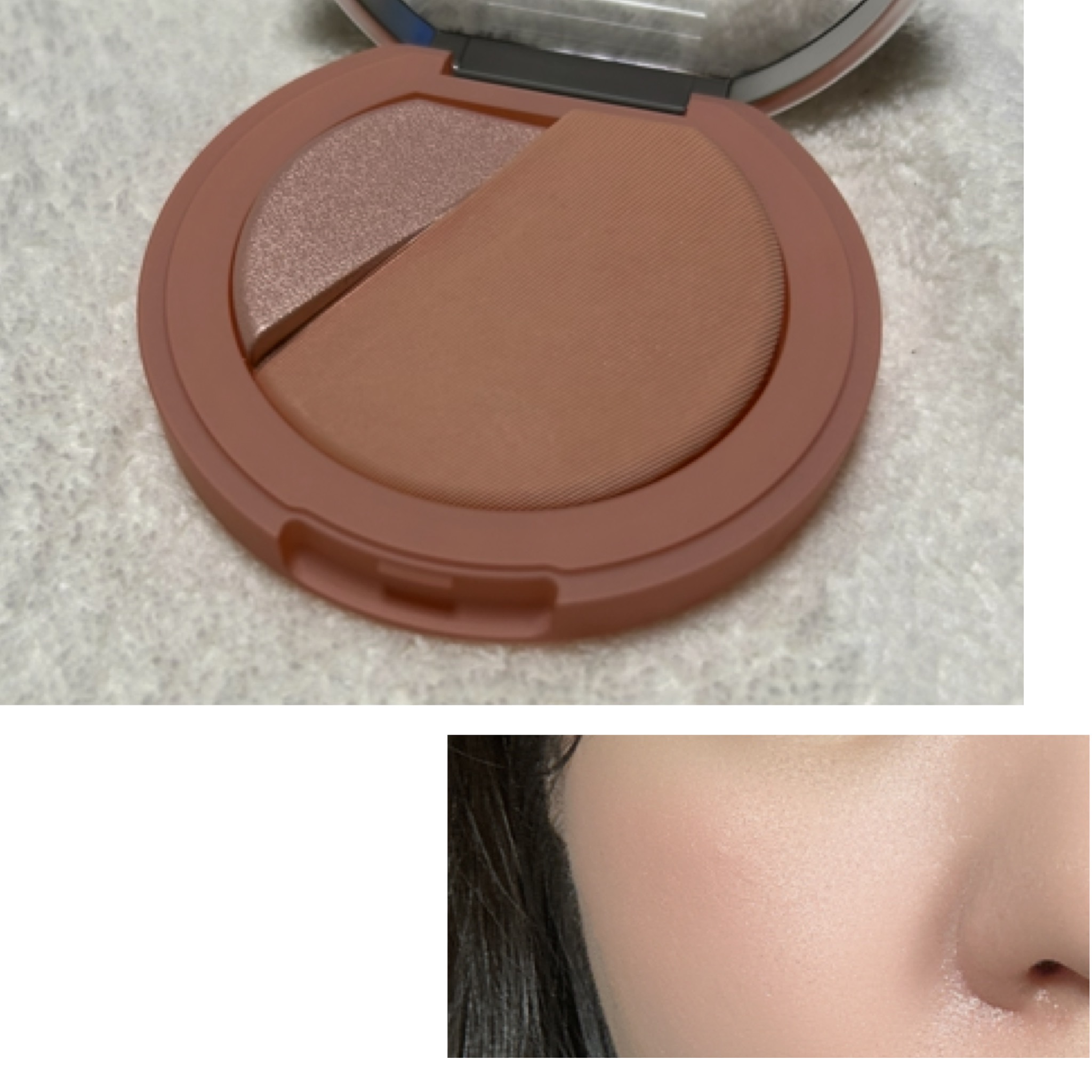 コントラストカラーとグラデーションカラー♡ 色相環の反対色と隣接色を利用したチークとハイライトがベストバランスを実現🖤🤍 ナチュラルに発色してくれるから自分好みに調節しながら使えるし、自然に可愛くなれる! チークのふんわり発色感、オーロラハイライトの輝き💯 ぜひ試してみてください♡