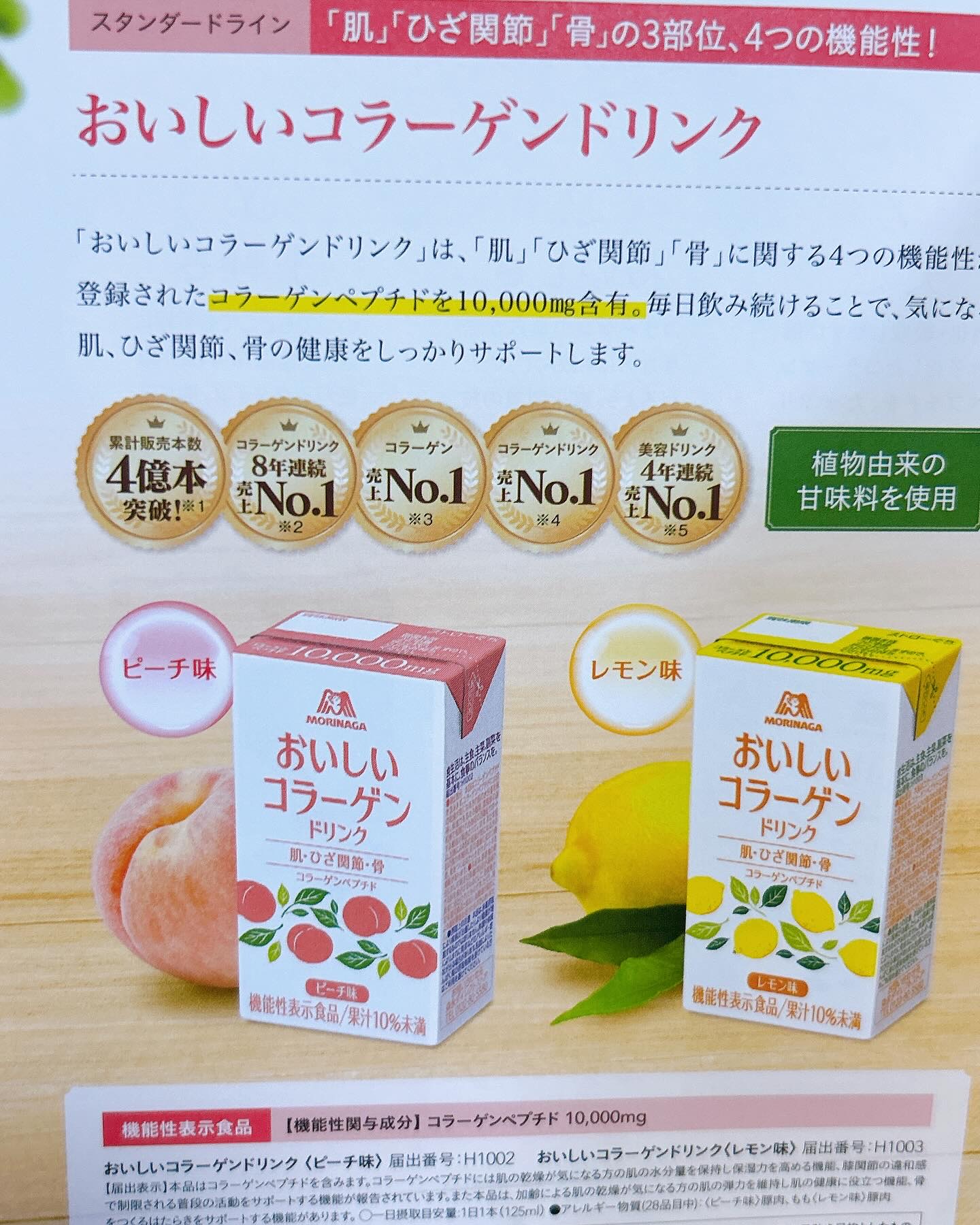 森永製菓の機能性表示食品「おいしいコラーゲンドリンク」ピーチ味/レモン味母がずっと飲み続けているので、気になってました。母は健康を気にした結果、コラーゲンを摂りたいとのことで定期便で送ってもらってるそう。若々しい振る舞いなのは、まさか...