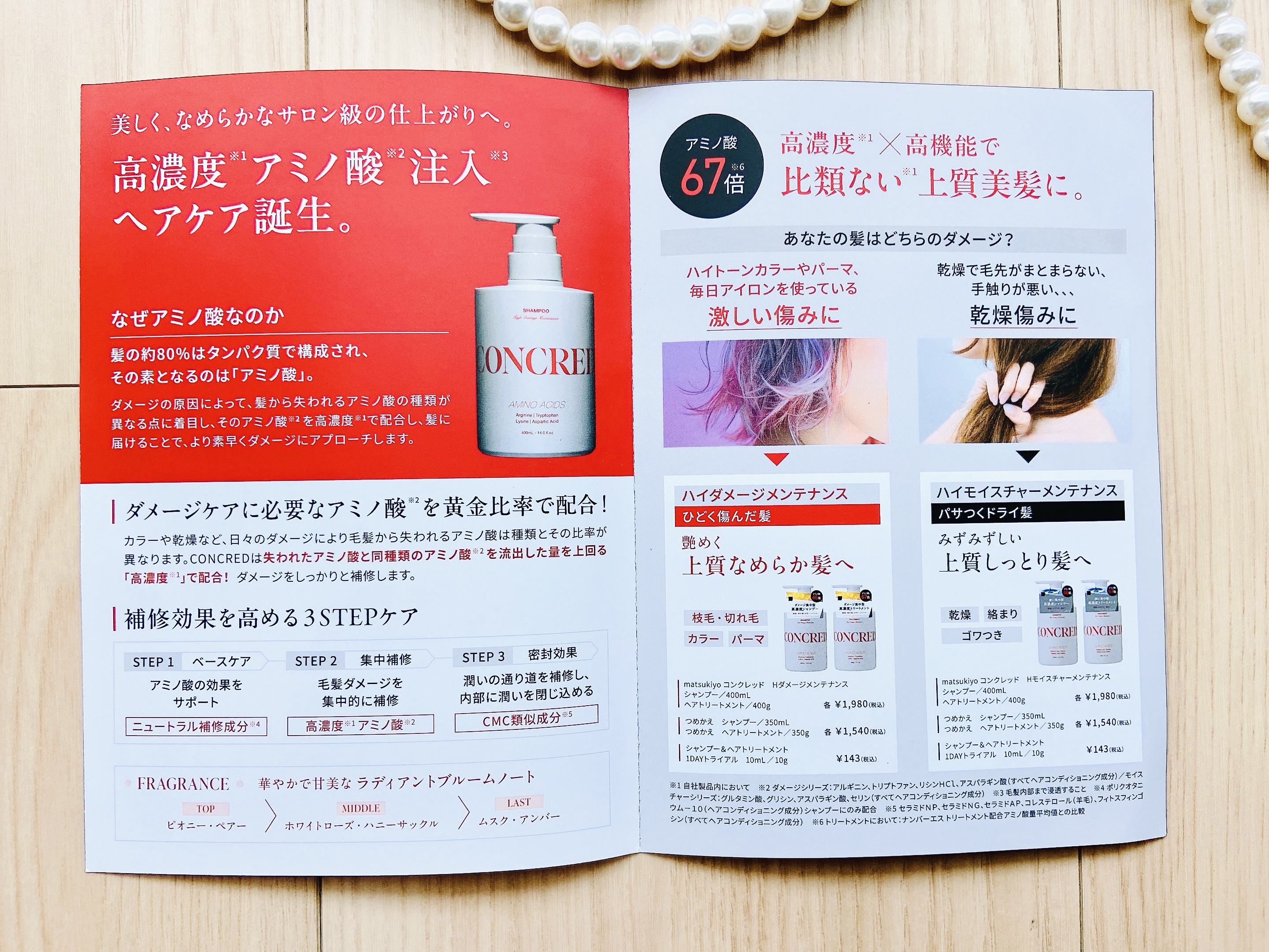 - <シャンプー 本体> 水、オレフィン(C14-16)スルホン酸Na、コカミドプロピルベタイン、ラウロイルメチルアラニンNa、ココイルメチルタウリンNa、コカミドDEA、アルギニン、トリプトファン、リシンHCl、アスパラギン酸、セラミドNP、セラミドNG、セラミドAP、コレステロール(羊毛)、フィトスフィンゴシン、ポリクオタニウム-10、ココイルグルタミン酸TEA、グリコシルトレハロース、デシルグルコシド、加水分解水添デンプン、ペンタステアリン酸ポリグリセリル-10、クエン酸、EDTA-2Na、クエン酸Na、フェノキシエタノール、安息香酸Na、塩化Na、ベヘニルアルコール、ステアロイルラクチレートNa、香料 <トリートメント 本体> 水、ソルビトール、プロパンジオール、ジメチコン、セテアリルアルコール、グリセリン、アモジメチコン、ステアロキシプロピルトリモニウムクロリド、エチルヘキサン酸セチル、セタノール、ステアリルアルコール、アルギニン、トリプトファン、リシンHCl、アスパラギン酸、セラミドNP、セラミドNG、セラミドAP、コレステロール(羊毛)、フィトスフィンゴシン、カエサルピニアスピノサヒドロキシプロピルトリモニウムクロリド、パルミチン酸デキストリン、スクワラン、ツバキ種子油、マカデミア種子油、ヒマワリ種子油、ジメチコノール、ベヘントリモニウムクロリド、ペンタステアリン酸ポリグリセリル-10、EDTA-2Na、ヒドロキシエチルセルロース、イソプロパノール、クエン酸、フェノキシエタノール、クエン酸Na、ベヘニルアルコール、ステアロイルラクチレートNa、香料 <シャンプー詰替> 水、オレフィン(C14-16)スルホン酸Na、コカミドプロピルベタイン、ラウロイルメチルアラニンNa、ココイルメチルタウリンNa、コカミドDEA、アルギニン、トリプトファン、リシンHCl、アスパラギン酸、セラミドNP、セラミドNG、セラミドAP、コレステロール(羊毛)、フィトスフィンゴシン、ポリクオタニウム-10、ココイルグルタミン酸TEA、グリコシルトレハロース、デシルグルコシド、加水分解水添デンプン、ペンタステアリン酸ポリグリセリル-10、クエン酸、EDTA-2Na、クエン酸Na、フェノキシエタノール、安息香酸Na、塩化Na、ベヘニルアルコール、ステアロイルラクチレートNa、香料 <トリートメント 詰替> 水、ソルビトール、プロパンジオール、ジメチコン、セテアリルアルコール、グリセリン、アモジメチコン、ステアロキシプロピルトリモニウムクロリド、エチルヘキサン酸セチル、セタノール、ステアリルアルコール、アルギニン、トリプトファン、リシンHCl、アスパラギン酸、セラミドNP、セラミドNG、セラミドAP、コレステロール(羊毛)、フィトスフィンゴシン、カエサルピニアスピノサヒドロキシプロピルトリモニウムクロリド、パルミチン酸デキストリン、スクワラン、ツバキ種子油、マカデミア種子油、ヒマワリ種子油、ジメチコノール、ベヘントリモニウムクロリド、ペンタステアリン酸ポリグリセリル-10、EDTA-2Na、ヒドロキシエチルセルロース、イソプロパノール、クエン酸、フェノキシエタノール、クエン酸Na、ベヘニルアルコール、ステアロイルラクチレートNa、香料