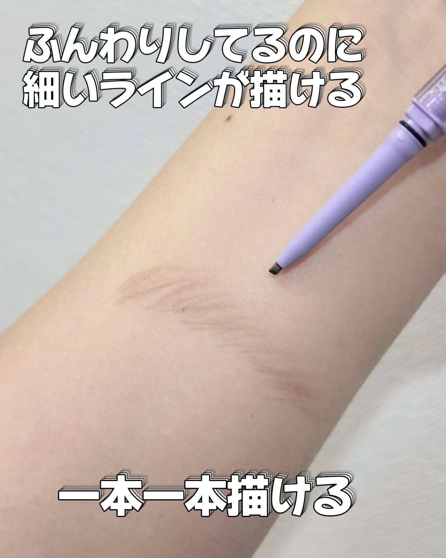 ムラにならないパウダリーテクスチャー&フィルムフォーマーエフェクト 1.5mmと細すぎず太すぎない芯で、一本一本描きやすく、反対側にスクリューブラシが付いていてふんわり眉が簡単に作れるのも◎👌✨ なめらかな描き心地で、反対側のブレンディングブラシでぼかすこともでき、ナチュラルな仕上がりに✨