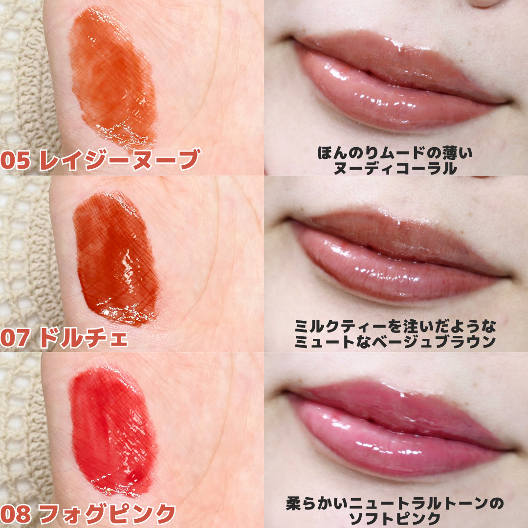 唇の上に天使の輪のような光沢を与えるグロス💋 もっちりとしたテクスチャーで、唇の気になる縦じわをカバーしながら、コーティングしたようにツヤのある仕上がりに💫 透け感のある発色で軽やかな印象を与えてくれます🫧 09,10は日本限定色でQoo10で購入できます。11はPLAZA限定色で、02のミニサイズとのセットで販売されています☺️
