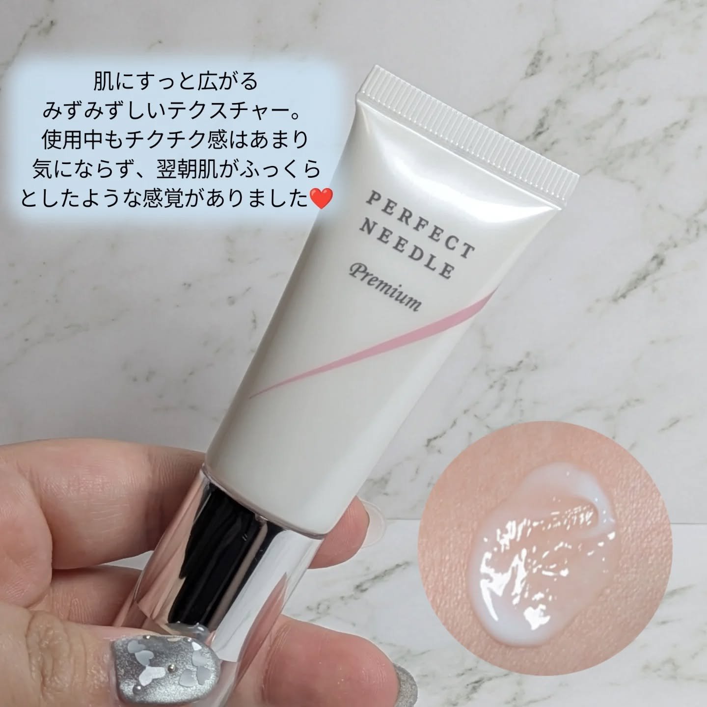 - POINT1.乾燥による小じわを目立ちにくくするジェル乳化処方 みずみずしいジェルの感触で広がり肌になじみやすく、なじんだ後はクリームの保護・保湿感が肌を包み込むジェル乳化処方です。乾燥が気になる素肌になじみやすく、シワのすき間にも美容成分を届けて、年齢に応じたスキンケアを強力にサポートします。化粧品機能評価法ガイドラインに基づく抗しわ効能評価試験を行い、4 週間の連用により乾燥による小じわが目立ちにくくなることを実証しました。 POINT2. 微細な美容針を約 60 万本配合して、角層に速攻アプローチ シリカなどのミネラル成分からできた海綿(かいめん)を微細に加工して、美容針*4 として配合しました。この美容針は、毛髪の 1/10 ほどの太さで、配合量が多すぎるとチクチクとした刺激感が強まり、少なすぎると効果を感じにくくなるため、適度な刺激感になるように商品 1 本 20gあたり約 60 万本の配合量としました。また、不純物が多い美容針原料を配合すると、水分と油分を混ぜる乳化に悪影響を及ぼし品質低下を招くおそれがあるため、パーフェクトニードル プレミアムでは原料を厳選し、さらに不純物を取り除く工程を加えるなど、成分の質と製造方法にもこだわりました。 *4:加水分解カイメン POINT3.ヒト幹細胞由来に加えて、多種多様な美容成分を配合 適度な刺激感を与える美容針*4 に加えて、角層を整えて守る様々な美容成分を厳選しました。特に話題のヒト幹細胞由来成分*5 やレチノール誘導体*2、ナイアシンアミド*3 に加え、バリア機能をサポートするセラミド*7 やサクラン*8、肌をすこやかに保ちながらハリ・ツヤのある素肌へと導くさまざまな保湿成分・整肌成分・ハリサポート成分・バリアサポート成分を配合しています。 *2:パルミチン酸レチノール(整肌成分) *3:整肌成分 *4:加水分解カイメン *5:ヒト脂肪細胞順化培養液エキス (整肌成分)*7:セラミド NP,セラミド AP,セラミド EOP(バリアサポート成分)*8:スイゼンジノリ多糖体(保湿成分)