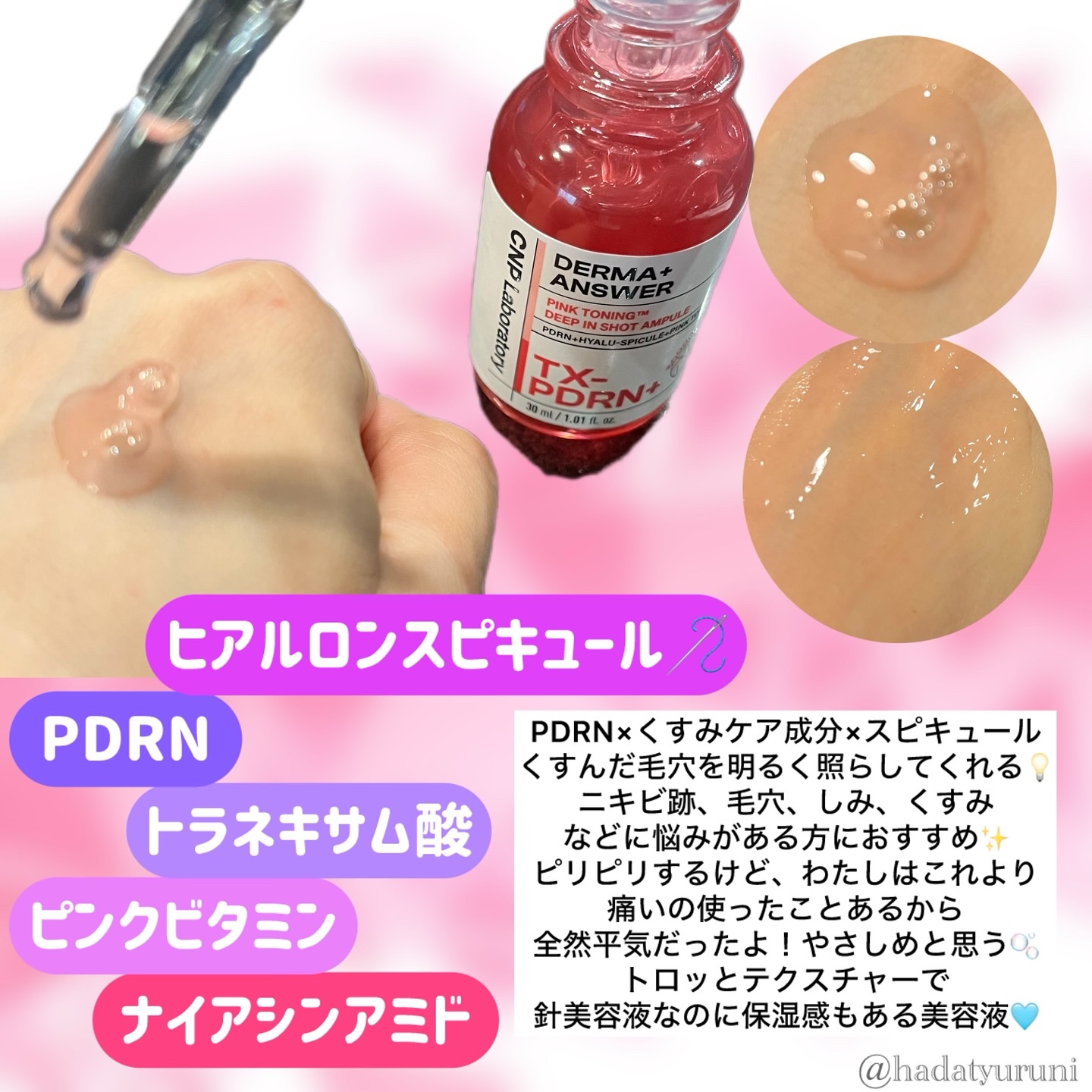 毛穴、ニキビ跡、シミが気になる方におすすめしたい針美容液です。 CNP独自の研究者500人が開発した「ヒアルロンスピキュール」で今までになかった針美容液の保湿感。 トラネキサム酸-ニキビ跡・シミケアに優れた成分でメラニン抑制、美白ケアに欠かせない成分。