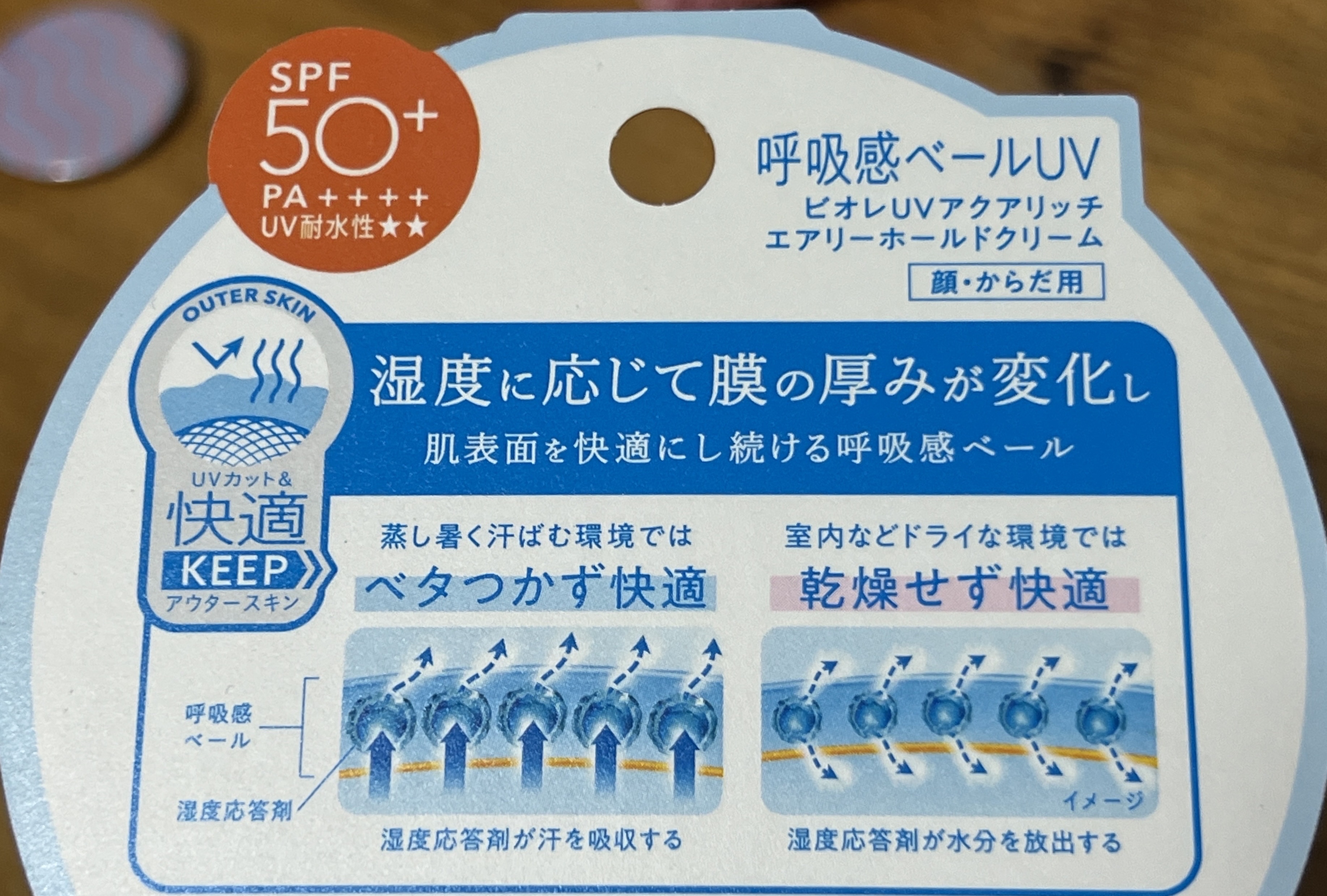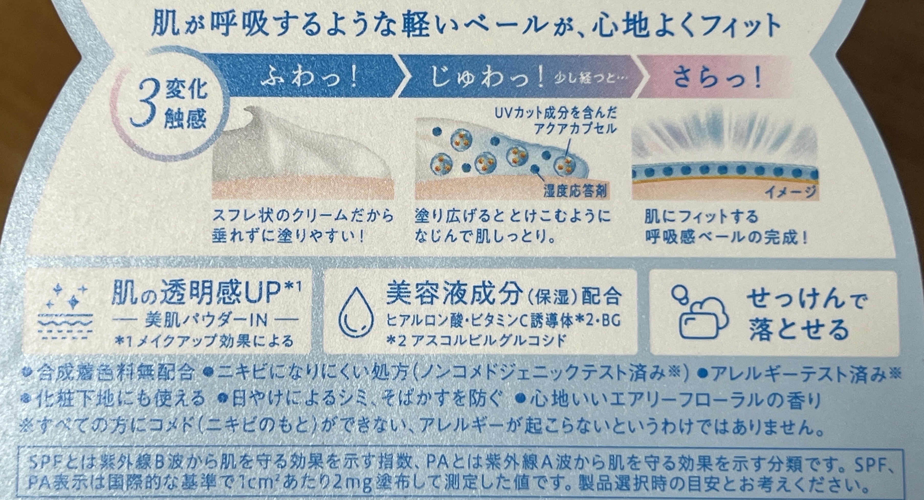 - 湿度の変化に応じて膜の厚みが変化! 肌表面を快適にし続ける「呼吸感ベールUV」 蒸し暑く汗ばむ環境ではベタつかず、 室内などドライな環境では乾燥を防ぎます。 テクスチャーは3変化する「密着スフレクリーム」。 出した瞬間は、ふわっ。 塗り広げるとじゅわっと肌に溶け込むようになじみ 少し経つと、さらっ。 肌が呼吸するような軽いベールが心地よくフィット。 SPF50+ PA++++。強力紫外線から肌を守ります。 さらに!うれしいポイント ・肌の透明感UP!*1美肌パウダーIN ・美容液成分(保湿)配合*2 ・スーパーウォータープルーフ ・汗水に強く、せっけんで落とせる ・化粧下地にも使える ・合成着色料無配合 ・アレルギーテスト済み*3 ・ニキビになりにくい処方(ノンコメドジェニックテスト済み*3 ) ・心地いいエアリーフローラルの香り *1メイクアップ効果 *2ヒアルロン酸・ビタミンC誘導体(アスコルビルグルコシド)・BG *3 すべての方にコメド(ニキビのもと)ができない、アレルギーが起こらないというわけではありません。