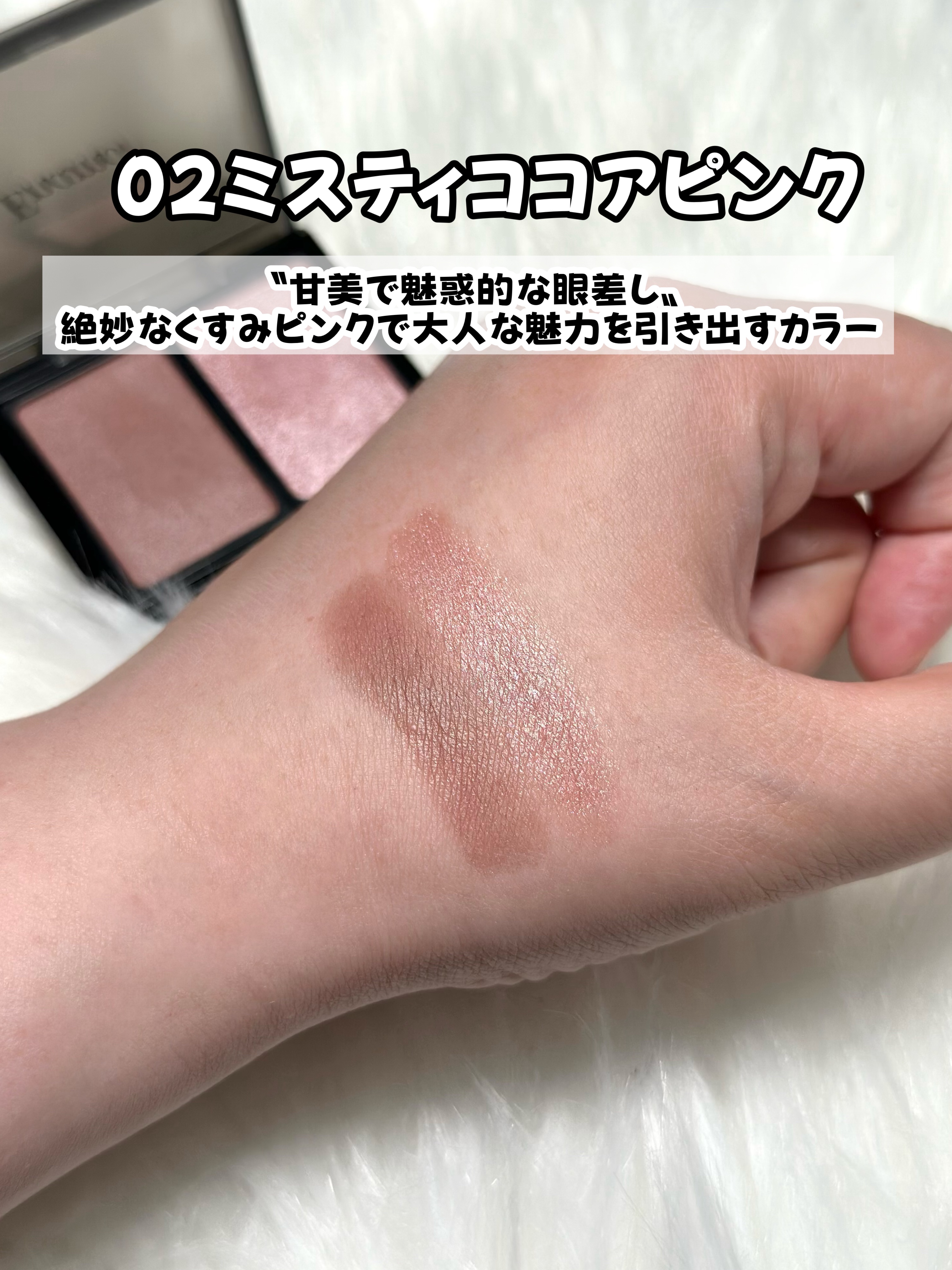 絶妙なくすみピンクで大人な魅力を引き出すカラー。 急いでいる時も指塗りでササッと! 濃いめの左側から目の際にのせたら、右側のハイライトカラーを重ねるだけでナチュラルなグラデに。 粉質がしっとりで、瞼にしっかり密着し、夕方・夜まで発色が長続き!