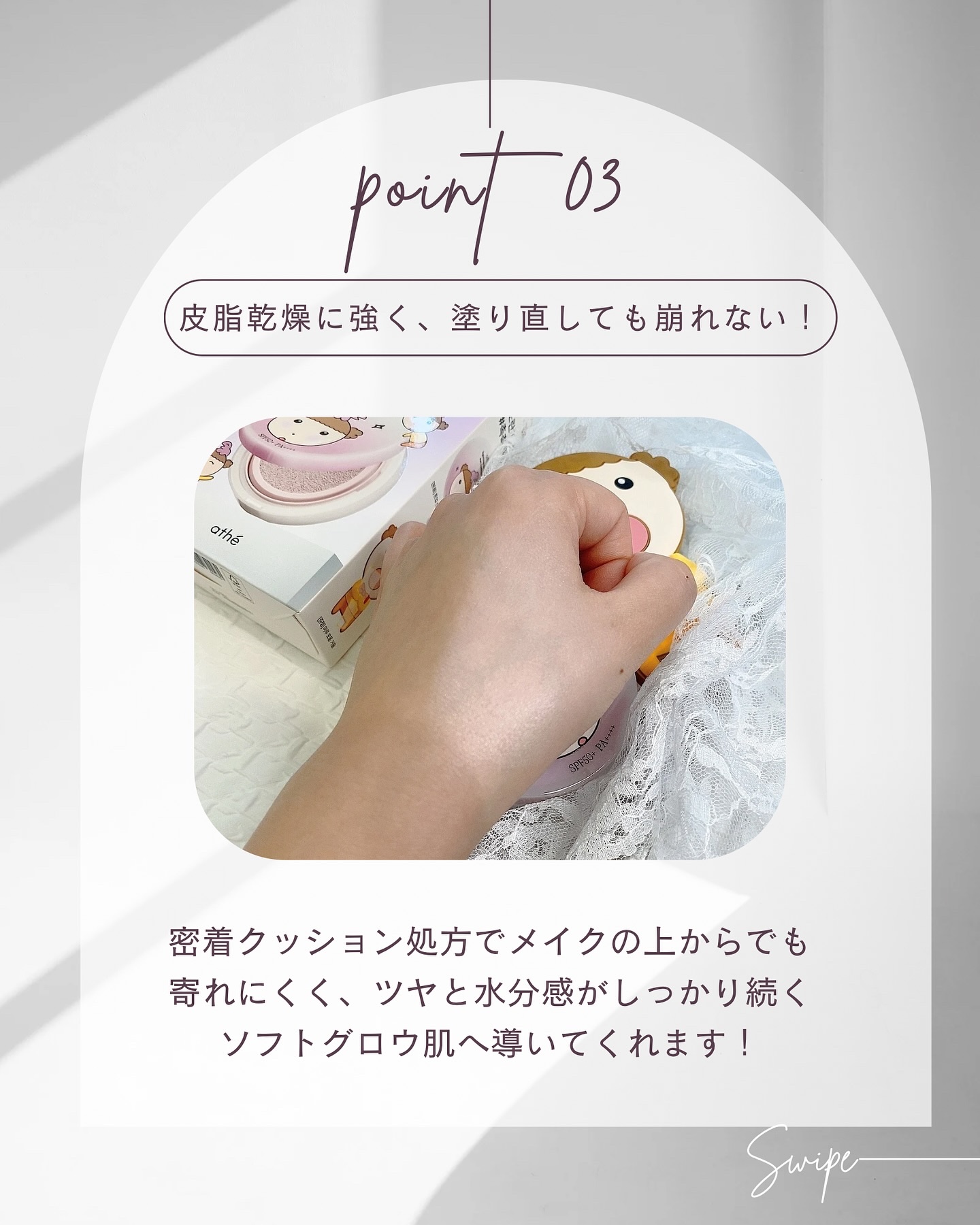 - 日焼け止め職人のathéが提案するこだわりのサンケア。 手軽に重ね塗りできるツヤ肌クッション。 ☑隠さず、輝かせる:輝くようなトーンアップ肌*1。 厚塗りでカバーするのではなく、水分と光を重ねてカバー。 ☑スキンケア効果のあるサンクッション:色素を減らし、スキンケア(保湿)成分をプラス。 スキンケア成分を55%以上配合*2 し、乾燥やカサつきを防ぐスキンケアサンクッション。 *1 メイクアップ効果による *2 水を含む