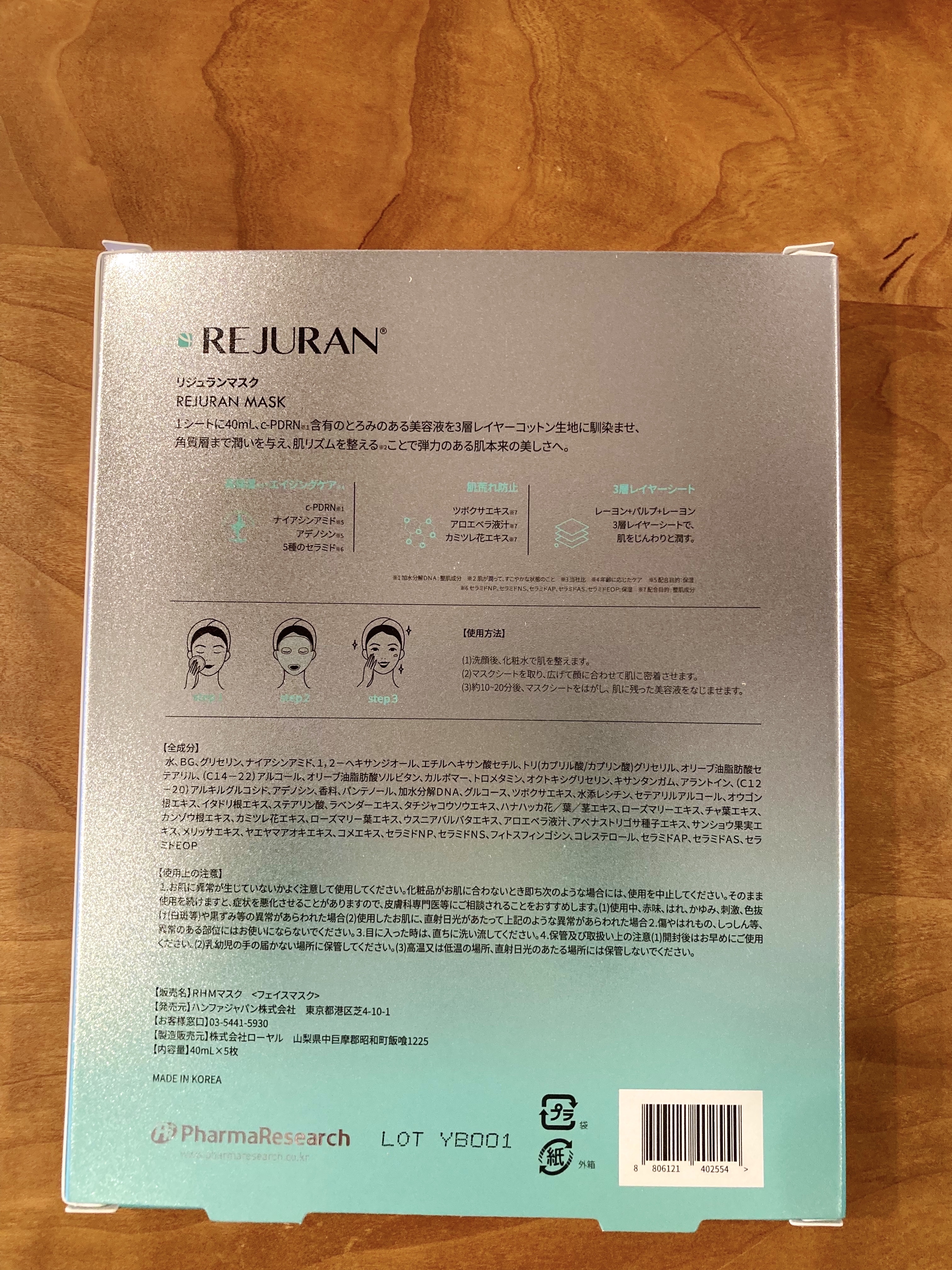 REJURAN「ターンオーバーマスク」を使用しました。マスク1枚に40mlの美容液配合でツボクサエキス*、アロエベラ液汁*カンゾウ根エキス*などの植物由来の美容成分が肌を集中的にケアしてくれます。*配合目的:成肌成分リジュランの独自成分c-P...