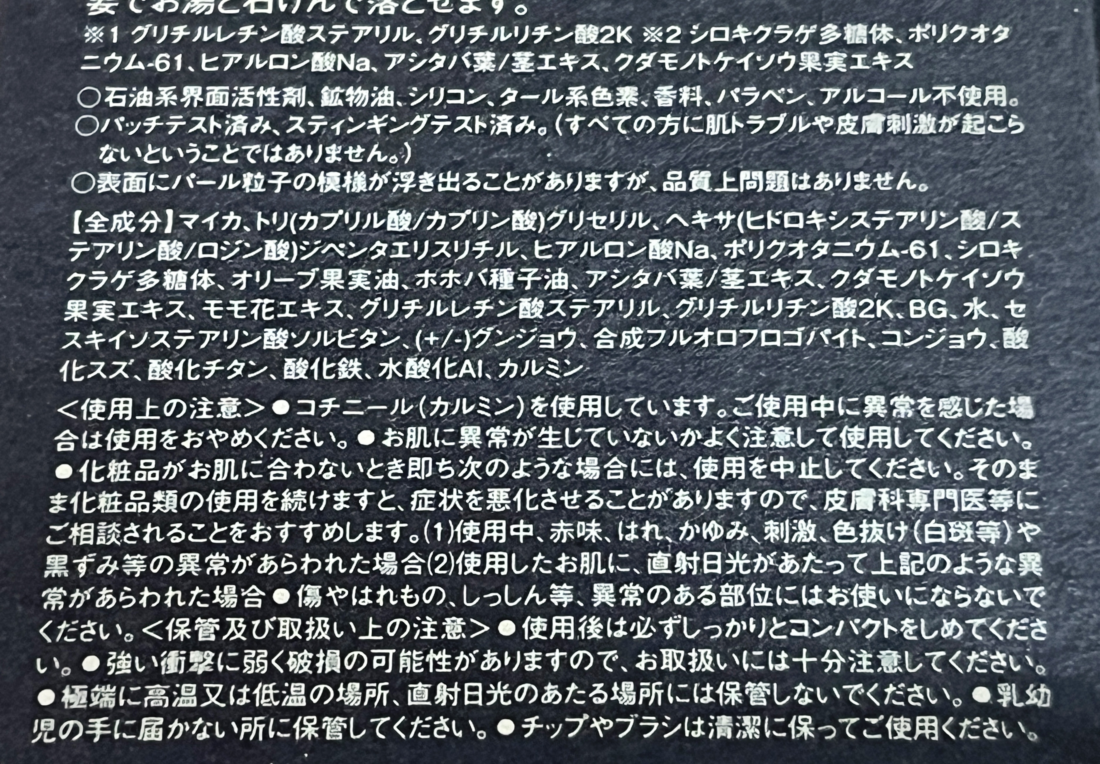 - <モーニングクルーズ> ⒶⒷマイカ、トリ(カプリル酸/カプリン酸)グリセリル、ヘキサ(ヒドロキシステアリン酸/ステアリン酸/ロジン酸)ジペンタエリスリチル、ホホバ種子油、オリーブ果実油、グリチルレチン酸ステアリル、ポリクオタニウム-61、シロキクラゲ多糖体、ヒアルロン酸Na、セスキイソステアリン酸ソルビタン、水、(+/-)合成フルオロフロゴパイト、酸化スズ、酸化チタン、酸化鉄、水酸化Al、カルミン Ⓒマイカ、トリ(カプリル酸/カプリン酸)グリセリル、ヘキサ(ヒドロキシステアリン酸/ステアリン酸/ロジン酸)ジペンタエリスリチル、ホホバ種子油、オリーブ果実油、グリチルレチン酸ステアリル、ポリクオタニウム-61、シロキクラゲ多糖体、ヒアルロン酸Na、セスキイソステアリン酸ソルビタン、水、(+/-)グンジョウ、合成フルオロフロゴパイト、酸化クロム、酸化スズ、酸化チタン、酸化鉄、水酸化Al Ⓓマイカ、トリ(カプリル酸/カプリン酸)グリセリル、ヘキサ(ヒドロキシステアリン酸/ステアリン酸/ロジン酸)ジペンタエリスリチル、ホホバ種子油、オリーブ果実油、グリチルレチン酸ステアリル、ポリクオタニウム-61、シロキクラゲ多糖体、ヒアルロン酸Na、セスキイソステアリン酸ソルビタン、水、(+/-)カオリン、合成フルオロフロゴパイト、酸化チタン、酸化鉄、シリカ、水酸化Al <マンダリンブラウン> ⒶⒸⒹマイカ、トリ(カプリル酸/カプリン酸)グリセリル、ヘキサ(ヒドロキシステアリン酸/ステアリン酸/ロジン酸)ジペンタエリスリチル、ホホバ種子油、オリーブ果実油、グリチルレチン酸ステアリル、ポリクオタニウム-61、シロキクラゲ多糖体、ヒアルロン酸Na、水、(+/-)合成フルオロフロゴパイト、酸化チタン、酸化鉄、水酸化Al、カルミン Ⓑマイカ、トリ(カプリル酸/カプリン酸)グリセリル、ヘキサ(ヒドロキシステアリン酸/ステアリン酸/ロジン酸)ジペンタエリスリチル、ホホバ種子油、オリーブ果実油、グリチルレチン酸ステアリル、ポリクオタニウム-61、シロキクラゲ多糖体、ヒアルロン酸Na、水、(+/-)合成フルオロフロゴパイト、酸化チタン、酸化鉄、水酸化Al <ロイヤルブラウン> ⒶⒸマイカ、トリ(カプリル酸/カプリン酸)グリセリル、合成フルオロフロゴパイト、ヘキサ(ヒドロキシステアリン酸/ステアリン酸/ロジン酸)ジペンタエリスリチル、ホホバ種子油、オリーブ果実油、グリチルレチン酸ステアリル、ポリクオタニウム-61、シロキクラゲ多糖体、ヒアルロン酸Na、水、(+/-)酸化チタン、酸化鉄、水酸化Al ⒷⒹマイカ、トリ(カプリル酸/カプリン酸)グリセリル、合成フルオロフロゴパイト、ヘキサ(ヒドロキシステアリン酸/ステアリン酸/ロジン酸)ジペンタエリスリチル、ホホバ種子油、オリーブ果実油、グリチルレチン酸ステアリル、ポリクオタニウム-61、シロキクラゲ多糖体、ヒアルロン酸Na、水、(+/-)酸化チタン、酸化鉄、水酸化Al、カルミン <ロゼブラウン> Ⓐマイカ、トリ(カプリル酸/カプリン酸)グリセリル、合成フルオロフロゴパイト、ヘキサ(ヒドロキシステアリン酸/ステアリン酸/ロジン酸)ジペンタエリスリチル、ホホバ種子油、オリーブ果実油、グリチルレチン酸ステアリル、ポリクオタニウム-61、シロキクラゲ多糖体、ヒアルロン酸Na、水、(+/-)酸化チタン、酸化鉄、水酸化Al ⒷⒸⒹマイカ、トリ(カプリル酸/カプリン酸)グリセリル、合成フルオロフロゴパイト、ヘキサ(ヒドロキシステアリン酸/ステアリン酸/ロジン酸)ジペンタエリスリチル、ホホバ種子油、オリーブ果実油、グリチルレチン酸ステアリル、ポリクオタニウム-61、シロキクラゲ多糖体、ヒアルロン酸Na、水、(+/-)酸化チタン、酸化鉄、水酸化Al、カルミン <モーブブラウン> Ⓐマイカ、トリ(カプリル酸/カプリン酸)グリセリル、合成フルオロフロゴパイト、ヘキサ(ヒドロキシステアリン酸/ステアリン酸/ロジン酸)ジペンタエリスリチル、ホホバ種子油、オリーブ果実油、グリチルレチン酸ステアリル、ポリクオタニウム-61、シロキクラゲ多糖体、ヒアルロン酸Na、水、(+/-)酸化チタン、酸化鉄、水酸化Al Ⓑマイカ、トリ(カプリル酸/カプリン酸)グリセリル、合成フルオロフロゴパイト、ヘキサ(ヒドロキシステアリン酸/ステアリン酸/ロジン酸)ジペンタエリスリチル、ホホバ種子油、オリーブ果実油、グリチルレチン酸ステアリル、ポリクオタニウム-61、シロキクラゲ多糖体、ヒアルロン酸Na、水、(+/-)コンジョウ、酸化チタン、酸化鉄、水酸化Al Ⓒマイカ、トリ(カプリル酸/カプリン酸)グリセリル、合成フルオロフロゴパイト、ヘキサ(ヒドロキシステアリン酸/ステアリン酸/ロジン酸)ジペンタエリスリチル、ホホバ種子油、オリーブ果実油、グリチルレチン酸ステアリル、ポリクオタニウム-61、シロキクラゲ多糖体、ヒアルロン酸Na、水、(+/-)グンジョウ、コンジョウ、酸化チタン、酸化鉄、水酸化Al、カルミン Ⓓマイカ、トリ(カプリル酸/カプリン酸)グリセリル、合成フルオロフロゴパイト、ヘキサ(ヒドロキシステアリン酸