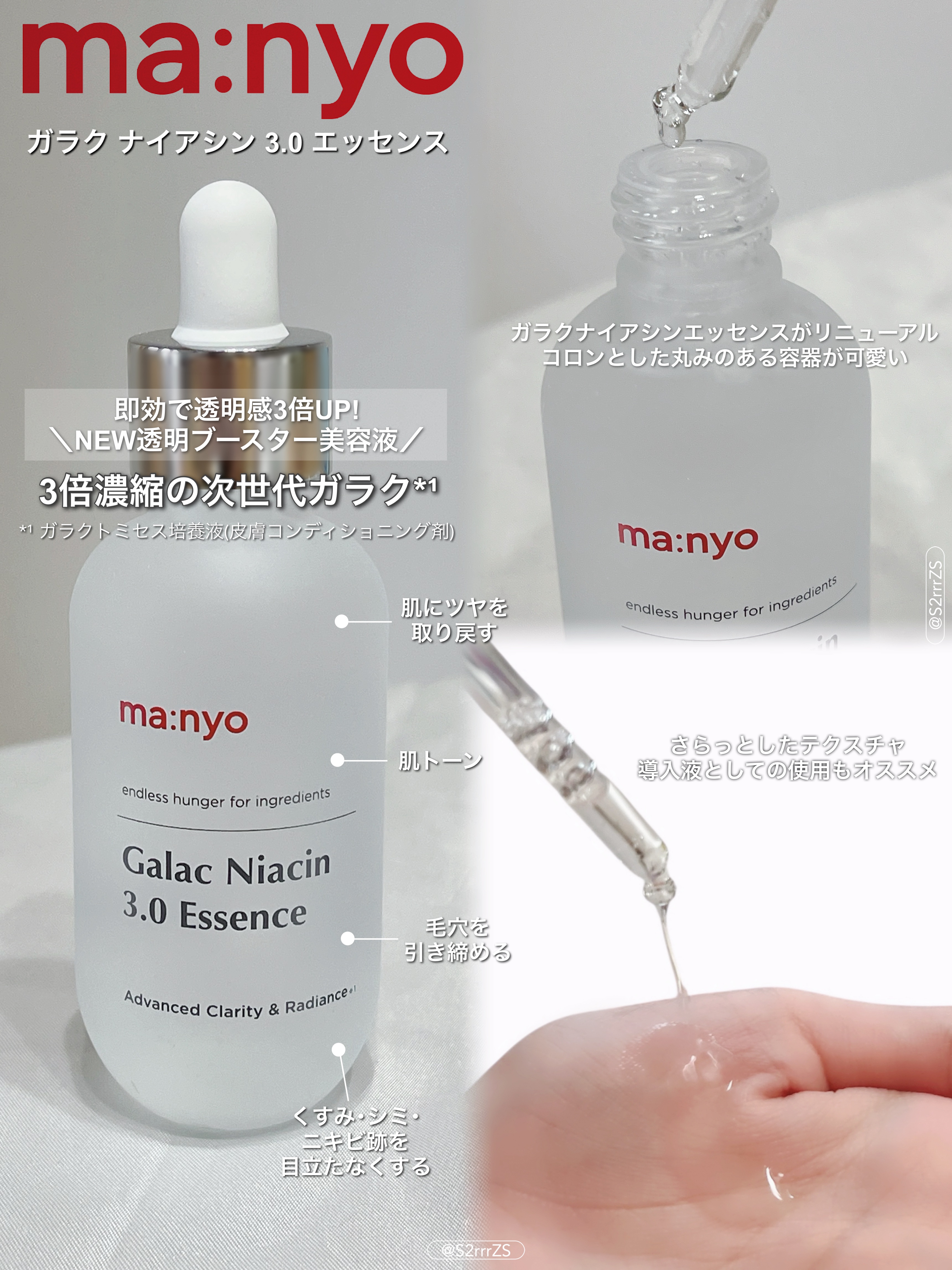 - ・manyoの独自成分!3倍*¹高濃縮でより強力な3世代ガラク 電気石を発酵器に添加し、微生物の成長に刺激を与えガラクトミセス菌の活性度増加!生長性の高いガラクトミセス菌株からガラクトミセス培養液*²を抽出し、肌のキメケアとともに透明感*³のあるお肌へ *¹ 3倍は高濃縮工程前、初期のガラクトミセス培養液(皮膚コンディショニング剤)と比較した場合 *² 皮膚コンディショニング剤 *³ キメが整った肌が与える印象のこと ・肌トーンケア*⁴、毛穴ケア*⁵、肌キメケア*⁶まで、保湿効果 3世代ガラク(Galactomy Active™ 7)と、ナイアシンアミド²配合で保湿成分をより強化し、くすんだ肌トーン*⁸から肌キメ、毛穴*⁵までケアします。 *⁴ 保湿により肌にツヤを与え明るい印象に見せること *⁵ 保湿することで肌をなめらかに整えツヤを与えることで毛穴を目立たなくすること *⁶ キメが整った素肌へ導くお手入れのこと *⁷ ガラクトミセス培養液、BG(どちらも皮膚コンディショニング剤)、1,2-ヘキサンジオール(溶剤) *⁸ 乾燥による ・水のようなさらっとしたテクスチャーで、べたつかず角質層まですっと浸透 保湿成分配合のウォータリーテクスチャーで、使用感は既存の「ガラク ナイアシン 2.0 エッセンス」と同じくさらっとした水のようなテクスチャー。角質層まで素早く浸透!べたつかない使用感で使いやすくて、角質層の奥まで潤い、表面はなめらかで整った肌へ 3月17日(月)からオフラインのバラエティショップで販売 3月24日(月)よりQoo10公式、楽天公式ショップで販売