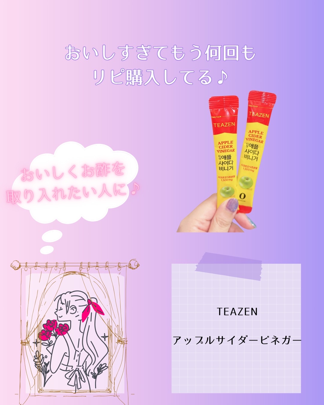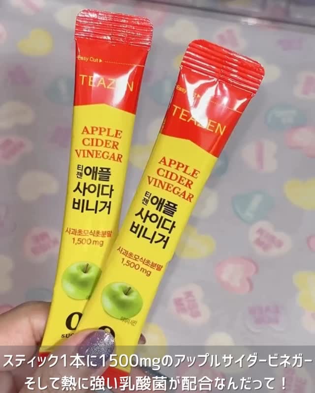 - リンゴの最も新鮮なゴールデンタイムを守るために、韓国の有名な産地で収穫された旬の青リンゴを使用。一般的なリンゴと比べてポリフェノールの量が10倍高いと言われており、精製水を一切添加せず、3段階の自然発酵過程を経て作られています。その結果、有機酸含有量は一般的なリンゴ酢の約2倍にあたる1,500mgを実現しました。 また、お酢が持つ独特な風味が苦手な方でも楽しめるように、リンゴジュースのようなフルーティで爽やかな味に仕上げています。 さらに、熱に強い次世代乳酸菌「ポストバイオティクス」を3種類配合。糖類ゼロ、1スティック15kcalの粉末スティック型で、水に溶かすだけで手軽にお楽しみいただけます。
