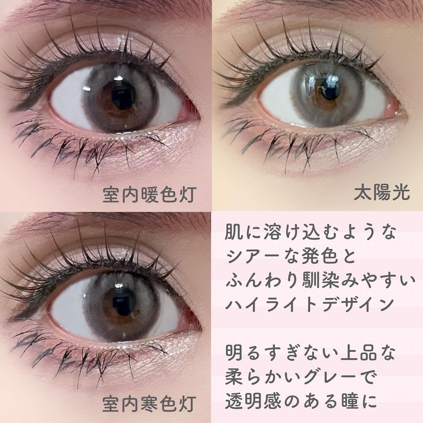 - 肌つやを重ねるように瞳にも艶を重ねる 艶というフィルターを重ねて、瞳の表情をかえる“ファンデ―ションレンズ” 「綺麗」と「色気」を両立 ・CUSHION GLOW クッショングロー レイヤリングする程色づく、自信みなぎる上品発色 パールを砕いたような光沢感のドレッシーカラー。 DIA14.2mm /GDIA 13.55mm ・GLASS MIRROR グラスミラー 純度の高いガラスのような、品格を醸し出すレーシィな発色。 瞳を透明感で満たすエレガントなティントブラウン。 DIA14.2mm /GDIA 12.90mm ・SHY ROUGE シャイルージュ 恥じらいをこめた血色感と美しさをエレベートするエアリー発色。 宝石のような輝きを塗る、ロージーなブラウンルージュ。 DIA14.2mm /GDIA 13.30mm ・SELENE GLOW セレングロー 肌に溶け込むシマーな発色が、 素肌と一体化するグレースグレーをより美しく引き立てる。 DIA14.2mm /GDIA 13.55mm カラーコンタクトレンズの不適正使用による眼障害の危険性等などがあります。 ●コンタクトレンズは高度管理医療機器です。不十分な洗浄・消毒など不適切なケアや、長時間・交換期間を超えた装用により、アレルギー性結膜炎、角膜感染症、角膜潰瘍等の重篤な眼障害が発生する危険性があります ●ご使用前に取扱説明書を確認してください 使用上の留意事項 ●眼科医院等を受診してからお求めください ●眼に異常を感じたら直ちにレンズ使用を中止し、お近くの眼科等で診察を受けてください ●医師の指示にしたがってご使用ください ●コンタクトレンズを装用する場合、自覚症状がなくても、眼科医院等での定期検査を受けてください ●レンズに不具合がある場合は使用しないでください