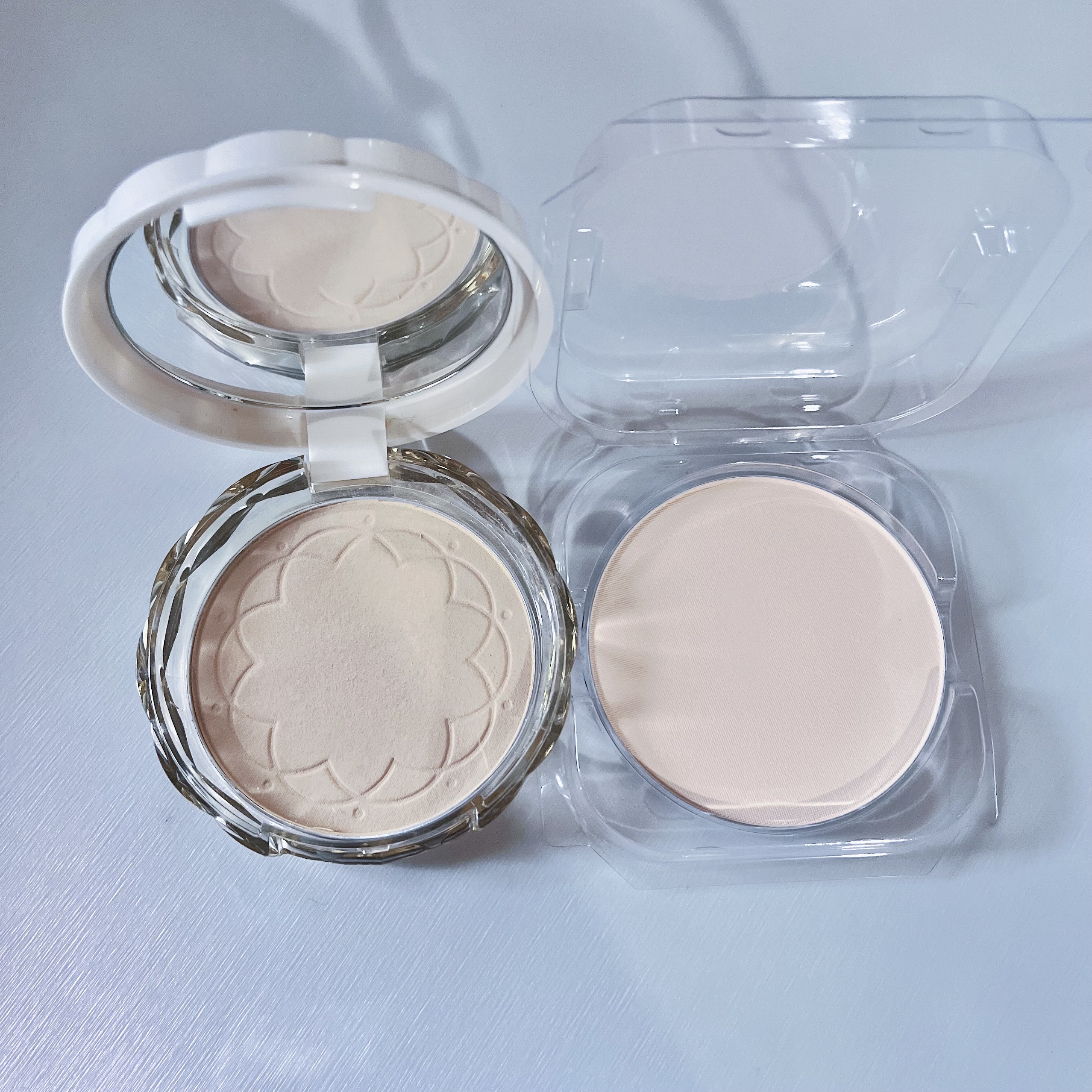 4色のパウダーでシルキー透明美肌仕上げ🫥 ✔️肌色を明るくトーンアップ* サラサラ微粒子パウダーが肌に溶け込むように馴染み、軽やかな付け心地 美肌フィルターをかけたようなふわさらマットな仕上がり。 メイク崩れやくすみづらいのもあり 日中メイク直ししなくても問題ないと個人的に思いました。