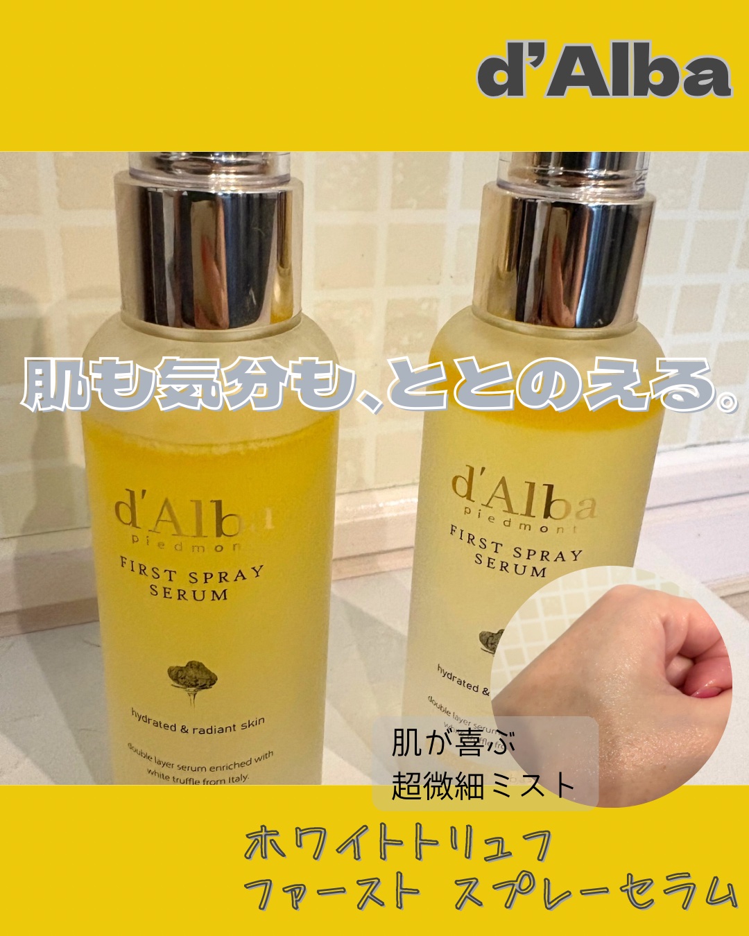 高級感のある透明のボトルからは中が2層になっているのがよく見えます。上の方が黄色く、下は透明です。 イタリア産ホワイトトリュフが入っているセラムです。オイルの層はボトルを振るとすぐに混ざります。 シュッシュッとお肌にかけてふんわりいい香りを楽しみます。とってもいい香りがするんですよ。
