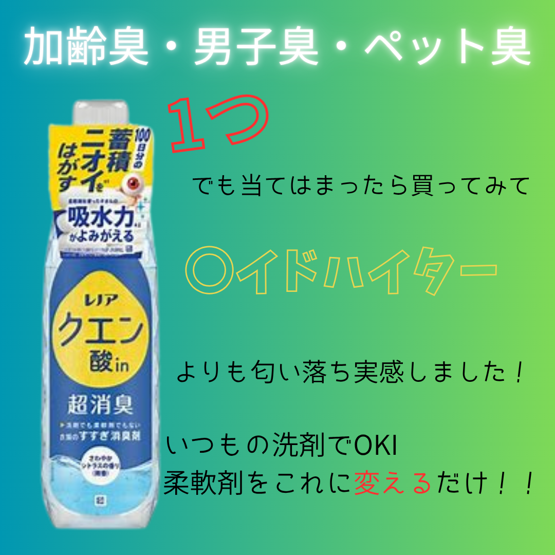 - “100日分の蓄積ニオイ*1”をはがし取る新技術を採用した「レノア クエン酸in超消臭」を使うことで、洗ってもニオイが戻ってきてしまうような使い続けたタオルでも、強い香りでごまかさず爽やかに洗い上げることができます。 いつものお洗濯の際に、柔軟剤トレイに「レノア クエン酸in超消臭」を入れるだけ、と使い方も簡単です。 自然由来のクエン酸を配合しております。肌にも優しく、赤ちゃんのタオルや肌着などにもお使いいただけます。 *1 100日間、洗浄・使用しても蓄積するニオイ