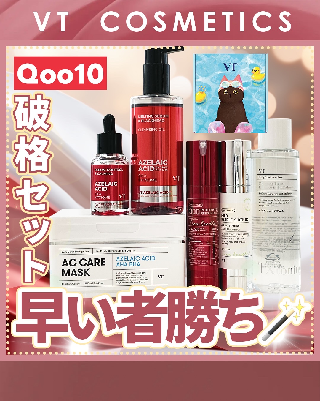 今回のQoo10メガ割もお得すぎるー!🉐前回のQoo10メガ割でランキング上位を獲得した韓国イラストレーターとのコラボBOX第2弾❣️Qoo10メガ割限定!『VTメガ割限定BOXセット』の悩みニャンでも解決セット(アゼライン酸セット)人気のク...