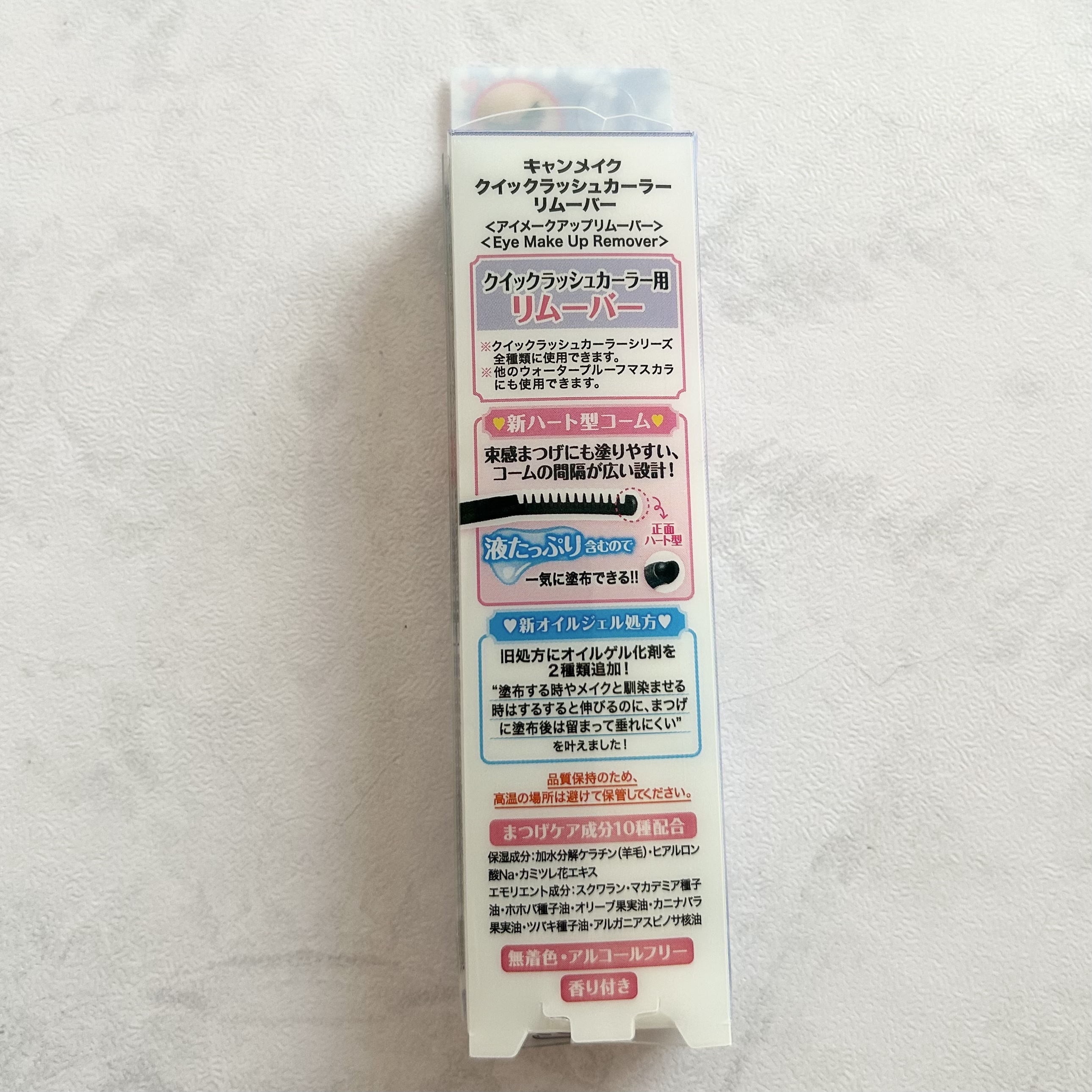 - こすらずするんと落とせる! カールキープの強いクイックラッシュカーラーを落とす用のリムーバー。 メイクになじみやすいクレンジングオイル処方により、こすらずするんとオフできます。 クイックラッシュカーラー全種はもちろん、 他のウォータープルーフ(油性タイプ)のマスカラにも使用できます。 旧コームに比べてコームの間隔が広くなったため、 まつげに引っかからずに塗りやすい♪ また、旧処方からオイルゲル化剤を2種類追加し 「塗る時やメイクとなじませる時はするする~と伸びるのに、 まつげに塗った後はピタッ!と留まって垂れにくい」を叶えました!