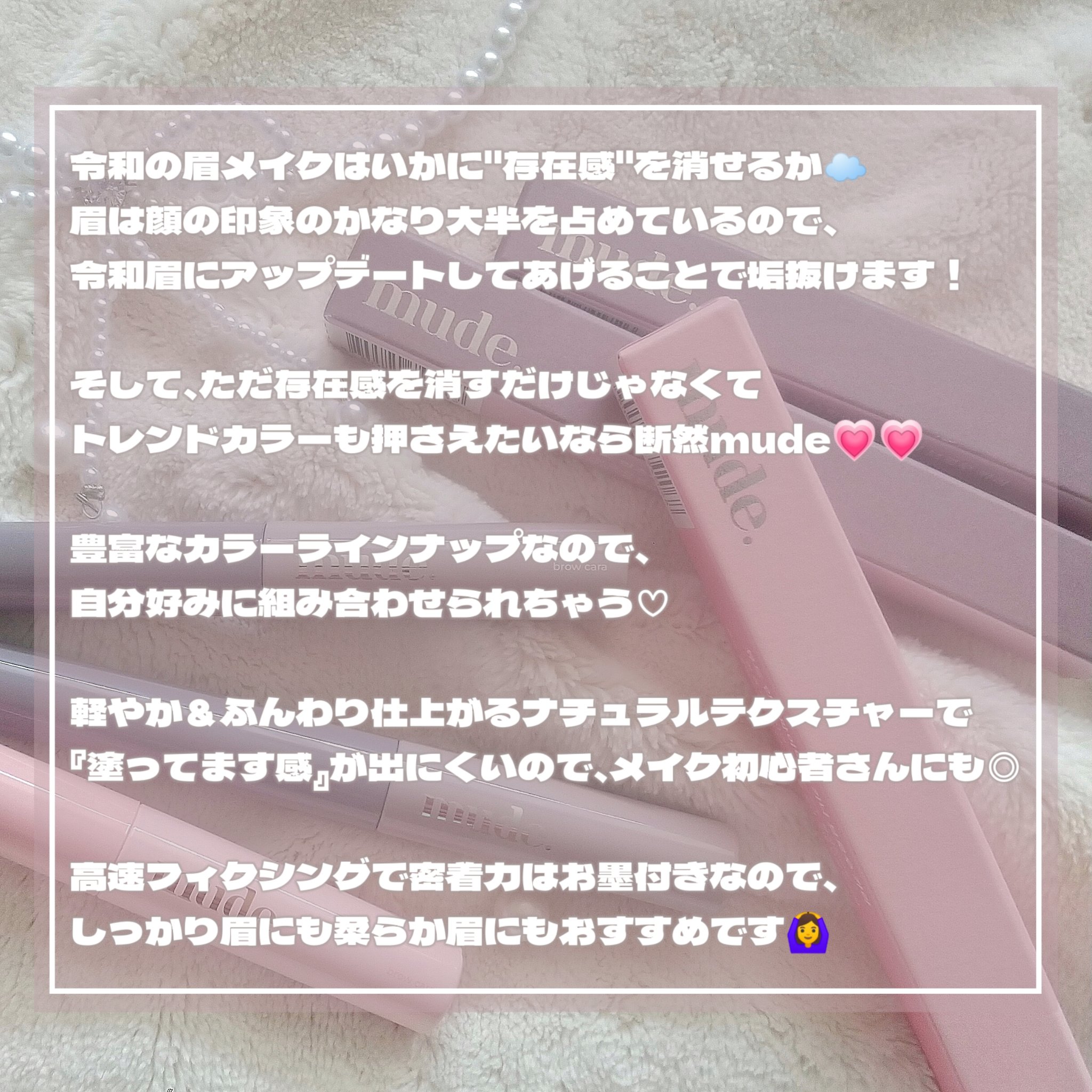 馴染む眉マスカラ🩷𝐦𝐮𝐝𝐞.インスパイアスキニーブロウカラB01ミルクティーC01フェードインP01バニーパーソナルカラーに合わせたり、気分によって変えてつかえるブロウカラー✨小さめのブラシで、塗りやすい〜🦋🎀1本1本を自然に整えてくれる、ム...