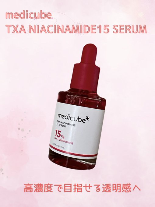 💧medicubeTXANIACINAMIDE15SERUM(メディキューブTXAナイアシンアミド15セラム)ナイアシンアミド15%とトラネキサム酸を配合した高濃度美白美容液。さらっと水のようなテクスチャーで、なじませると少しぺとっとした密着...