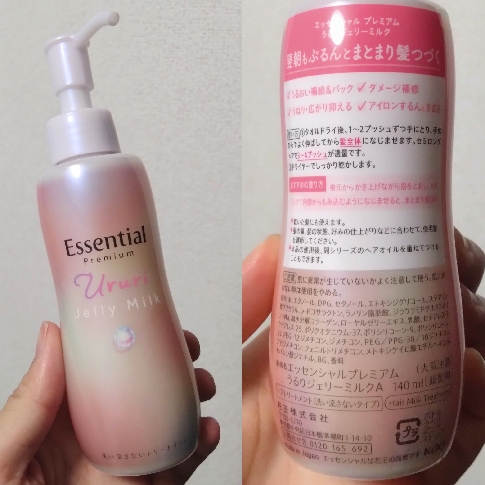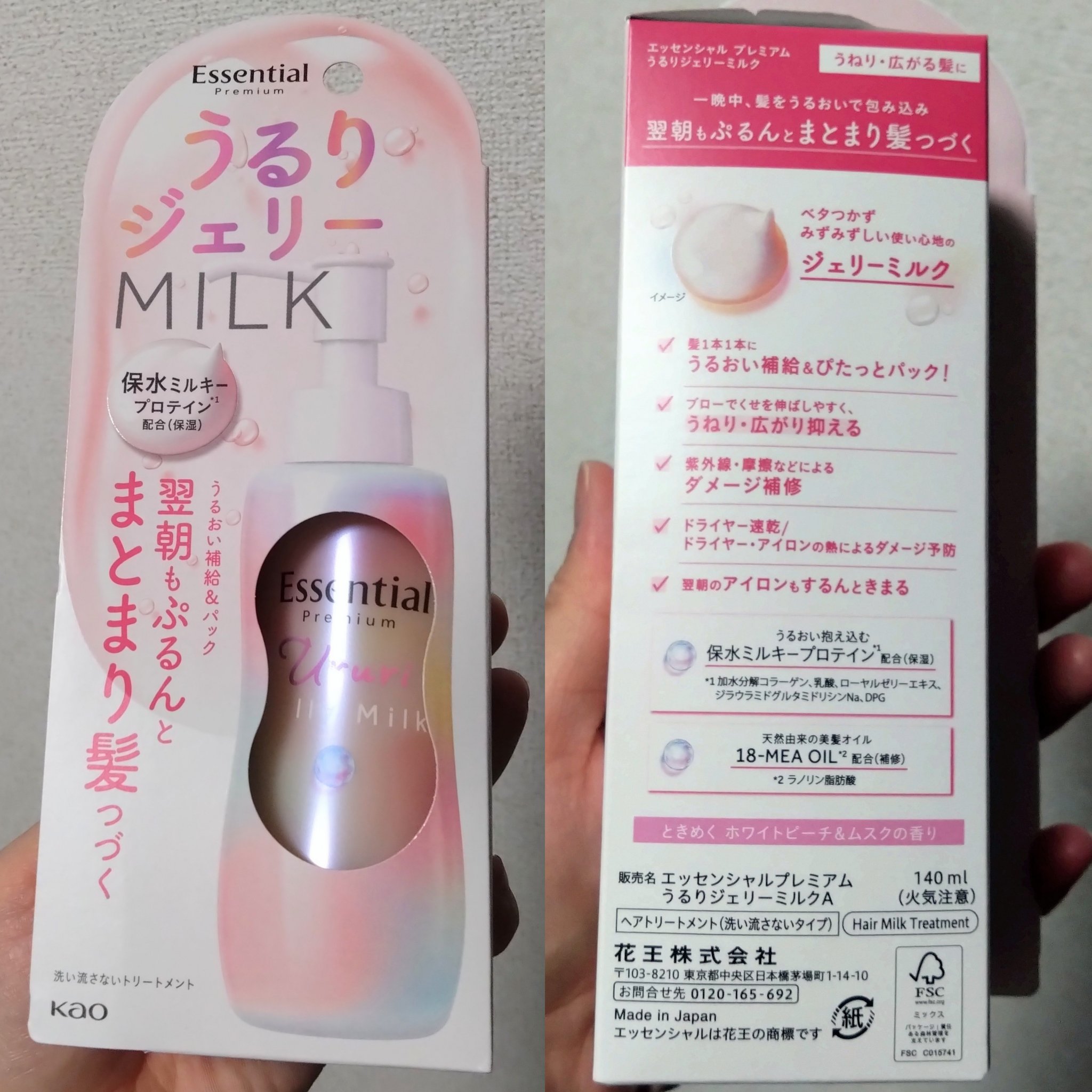 エッセンシャルプレミアムうるりジェリーミルク140mlLIPSプレゼントで当選しました。爽やかで甘い桃の香りです。学生時代の夏を想像します。次の日も潤っている感じがします。見た目は、櫛を通してもまとまり髪にはならなかったです。うるふわな髪にな...