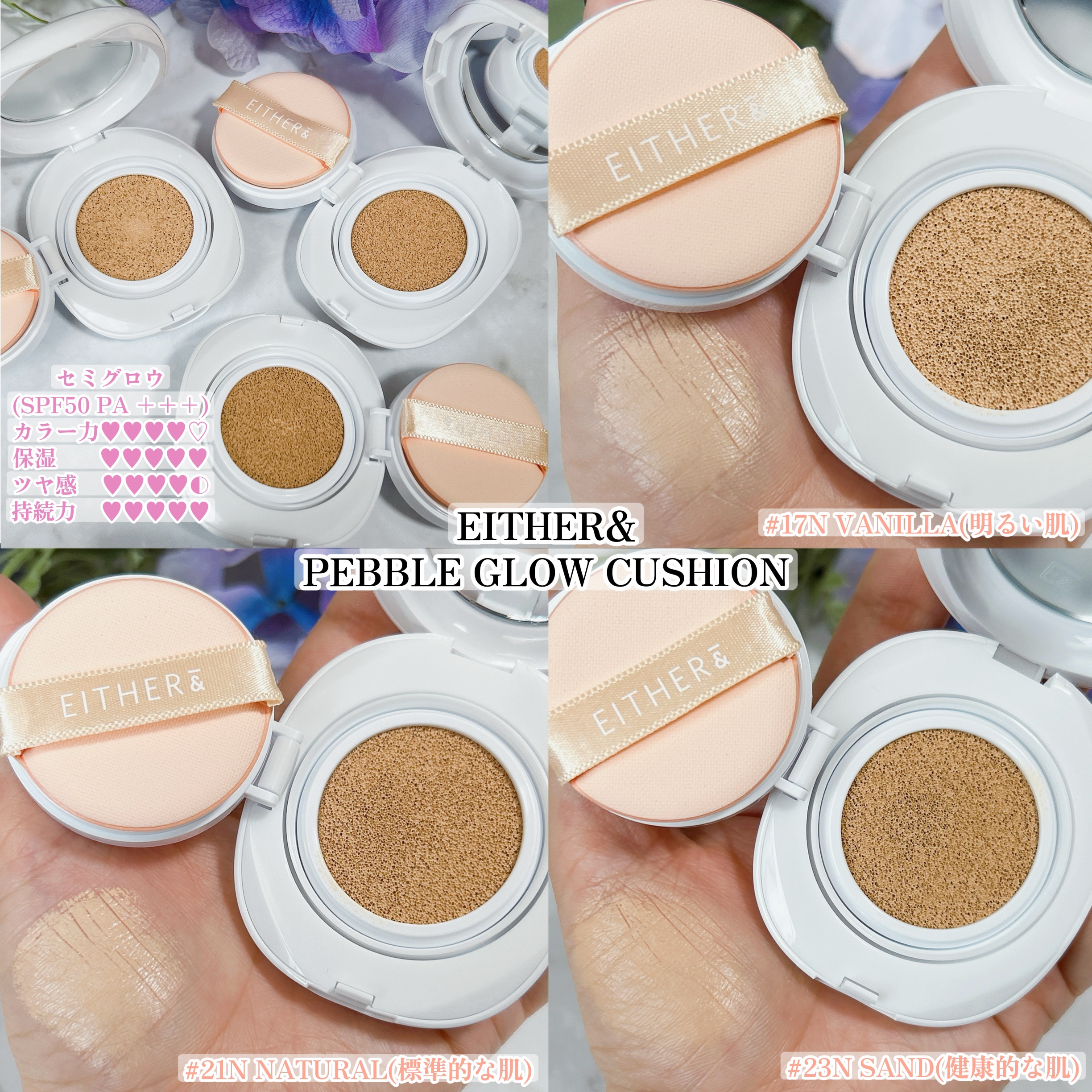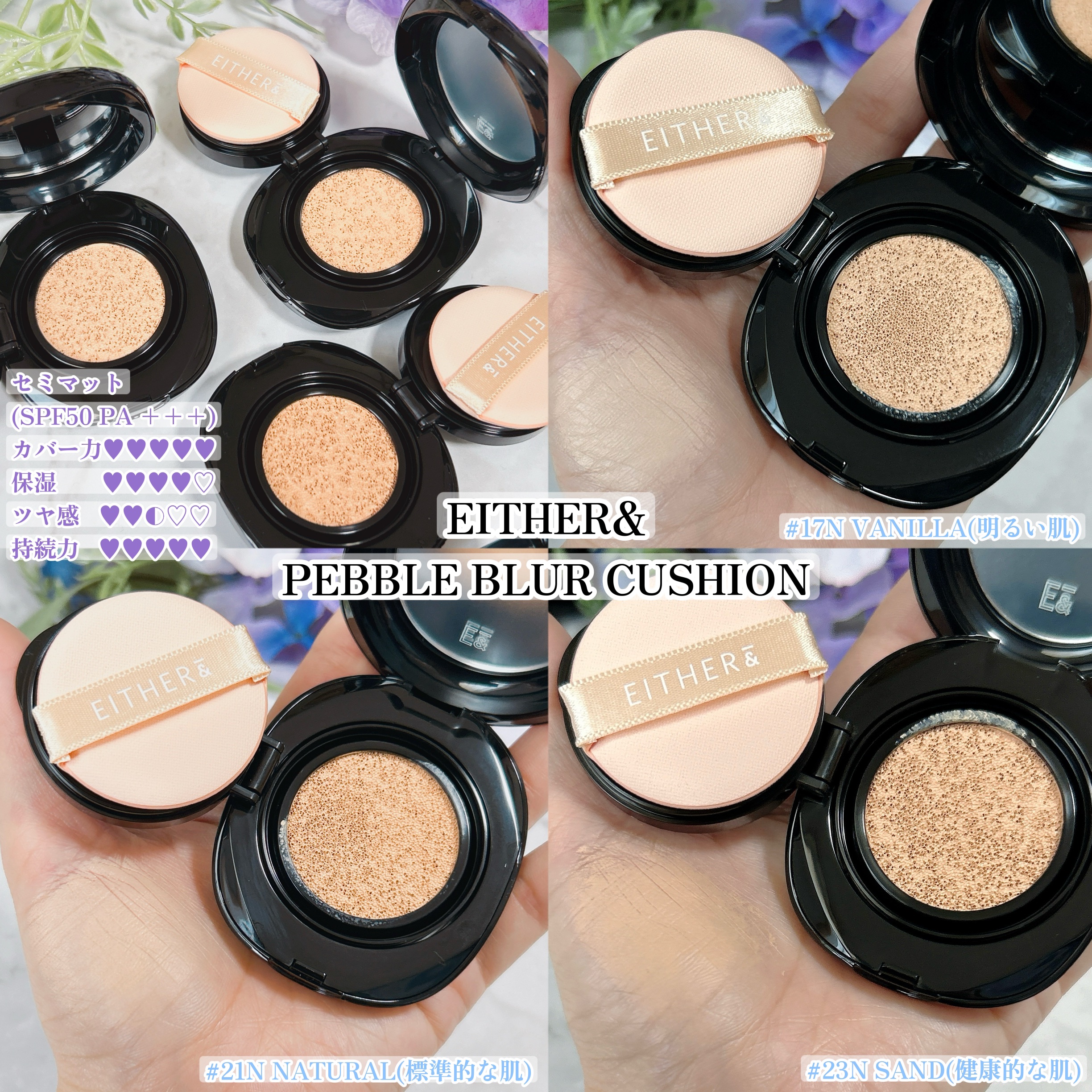 EITHER&ペブルブラークッション 17P21P毛穴レスなドール肌へ輝くAIフィルターブラークッション✨100時間メイクキープ✨美容液成分配合で潤いをチャージして保湿ケアセミマットタイプ🖤SPF50+PA+++カバー ★★★★★保湿 ★...