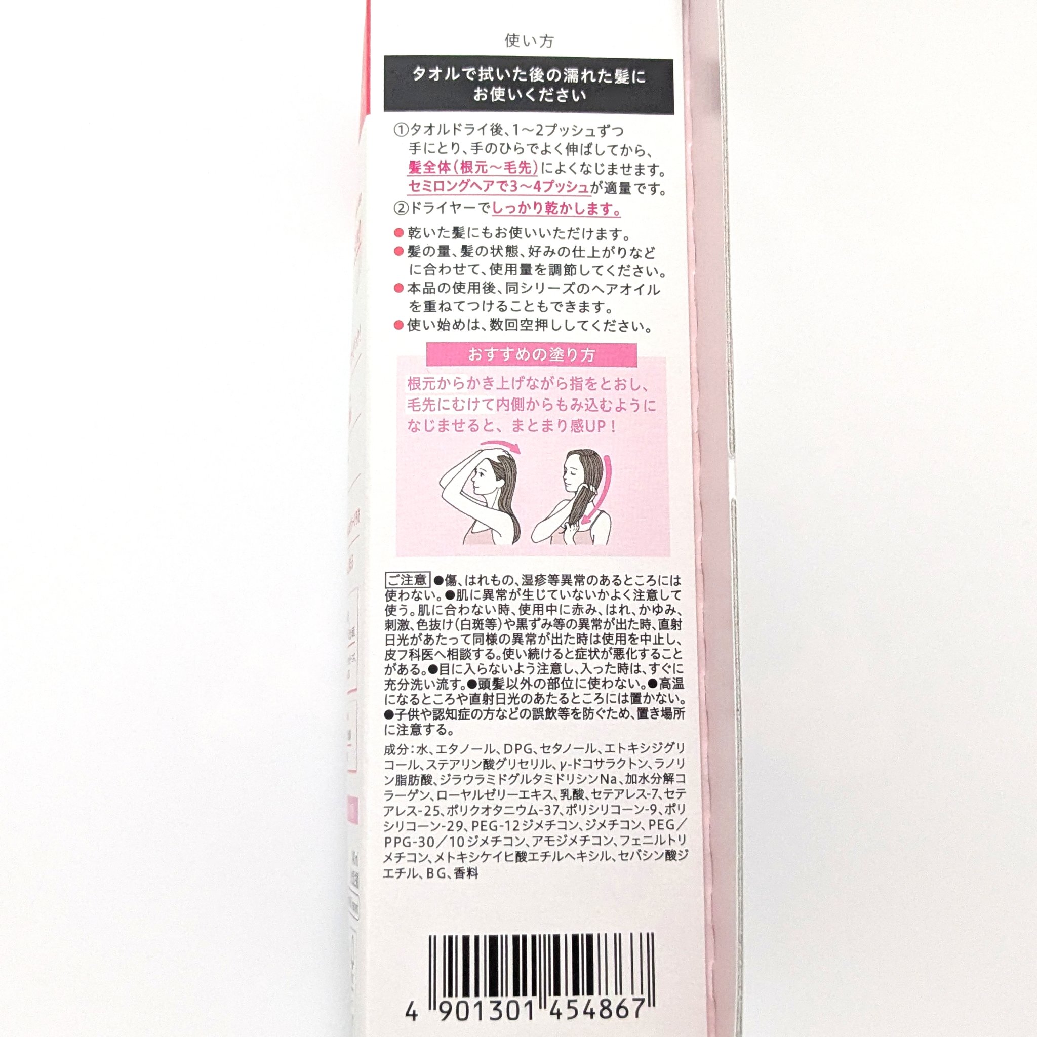 - <140ml > 水、エタノール、DPG、セタノール、エトキシジグリコール、ステアリン酸グリセリル、γ-ドコサラクトン、ラノリン脂肪酸、ジラウラミドグルタミドリシンNa、加水分解コラーゲン、ローヤルゼリーエキス、乳酸、セテアレス-7、セテアレス-25、ポリクオタニウム-37、ポリシリコーン-9、ポリシリコーン-29、PEG-12ジメチコン、ジメチコン、PEG/PPG-30/10ジメチコン、アモジメチコン、フェニルトリメチコン、メトキシケイヒ酸エチルヘキシル、セバシン酸ジエチル、BG、香料