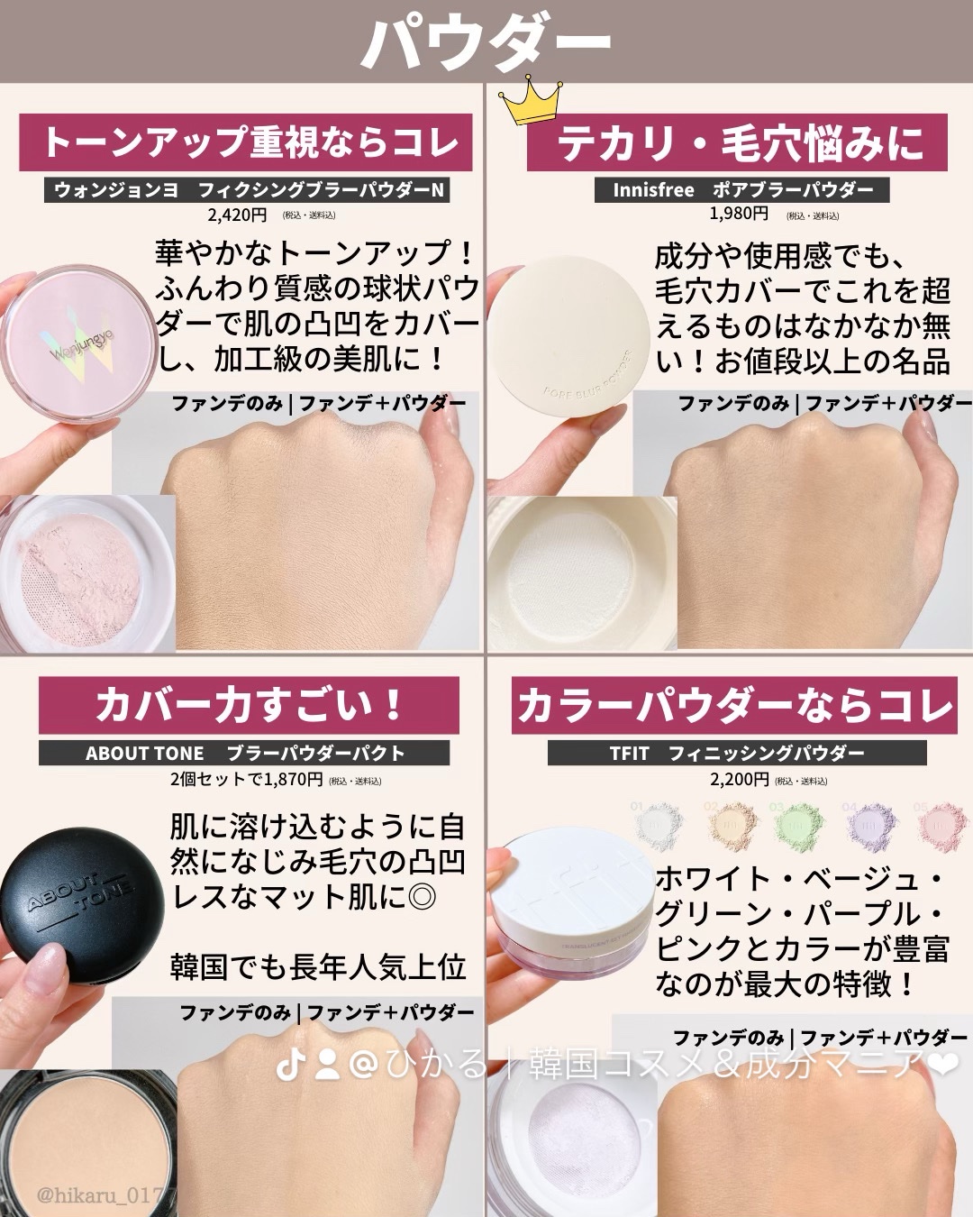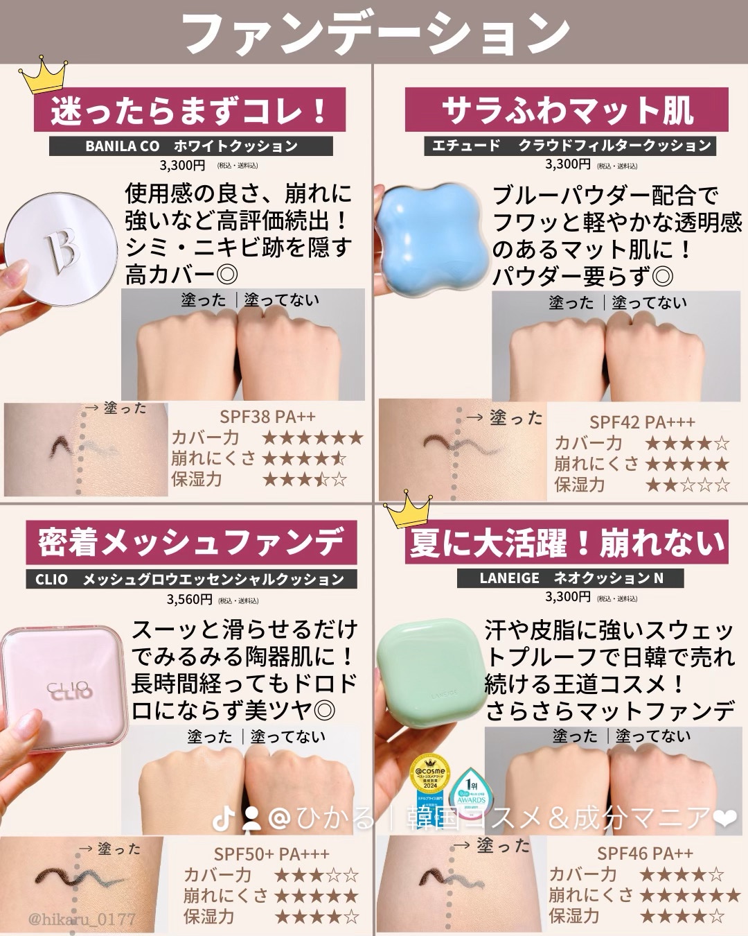 この中でも、ご相談いただいた時にまずオススメするのがジョンセンムル🙌 カラーや肌質など、ご自身にあったものを選べるのですが、私はトーンアップを使ってます💕 全体的なバランスが良いので、ひかるの中でも使用頻度が高いアイテムです💪✨ パパパッとメイクを済ませたいときや、ノーファンデな日にはナンバーズイン😍 これあると便利ですよ〜💓 商品名の通り、陶器肌に仕上がるし、マスクに本当に付きにくい✨ 保湿力やツヤ感、テクスチャーやカバー力など、それぞれ星や画像を参考に比較して、お買い物の参考に少しでもなれば嬉しいです🙌💕