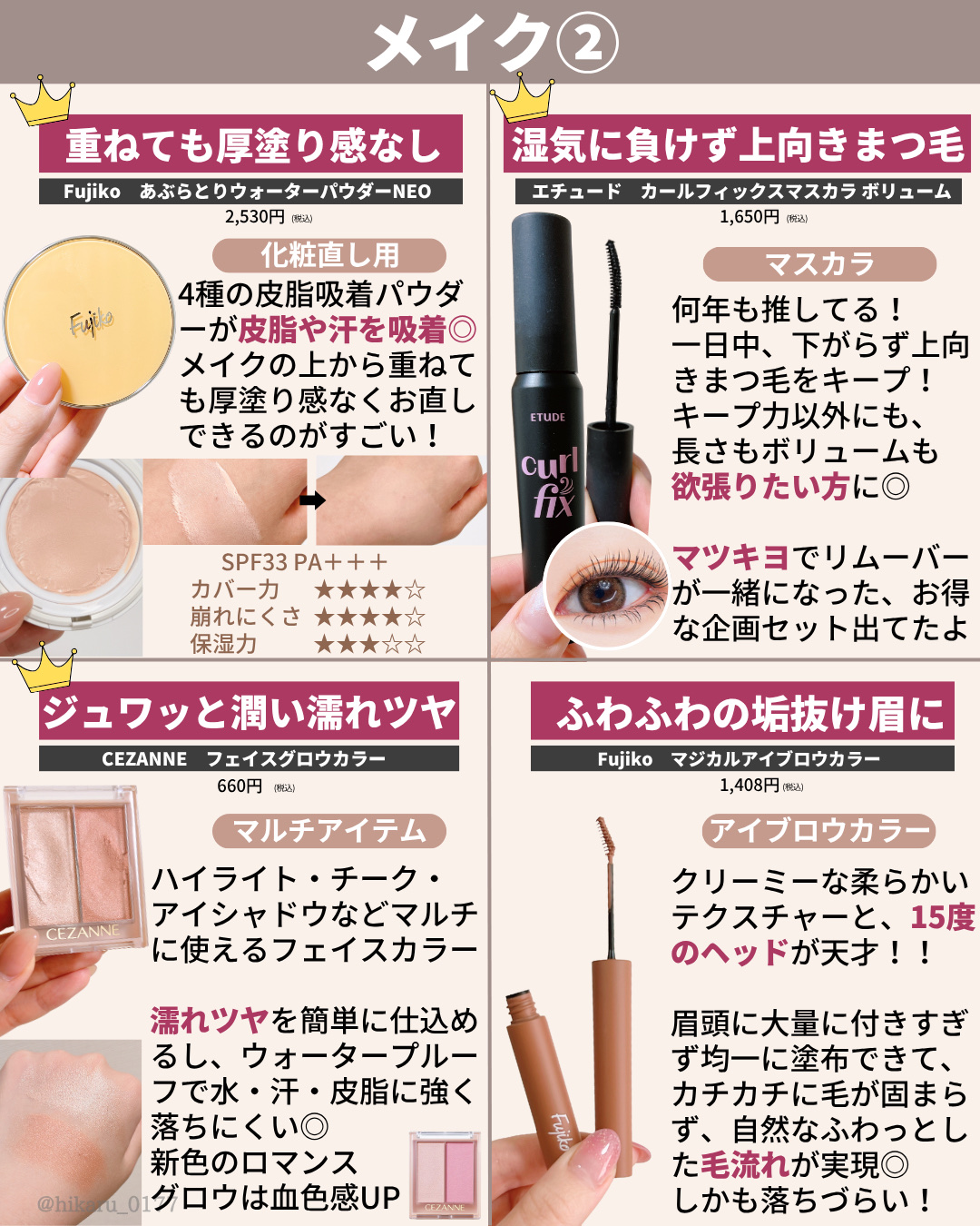 この中でも、ご相談いただいた時にまずオススメするのがジョンセンムル🙌 カラーや肌質など、ご自身にあったものを選べるのですが、私はトーンアップを使ってます💕 全体的なバランスが良いので、ひかるの中でも使用頻度が高いアイテムです💪✨ パパパッとメイクを済ませたいときや、ノーファンデな日にはナンバーズイン😍 これあると便利ですよ〜💓 商品名の通り、陶器肌に仕上がるし、マスクに本当に付きにくい✨ 保湿力やツヤ感、テクスチャーやカバー力など、それぞれ星や画像を参考に比較して、お買い物の参考に少しでもなれば嬉しいです🙌💕