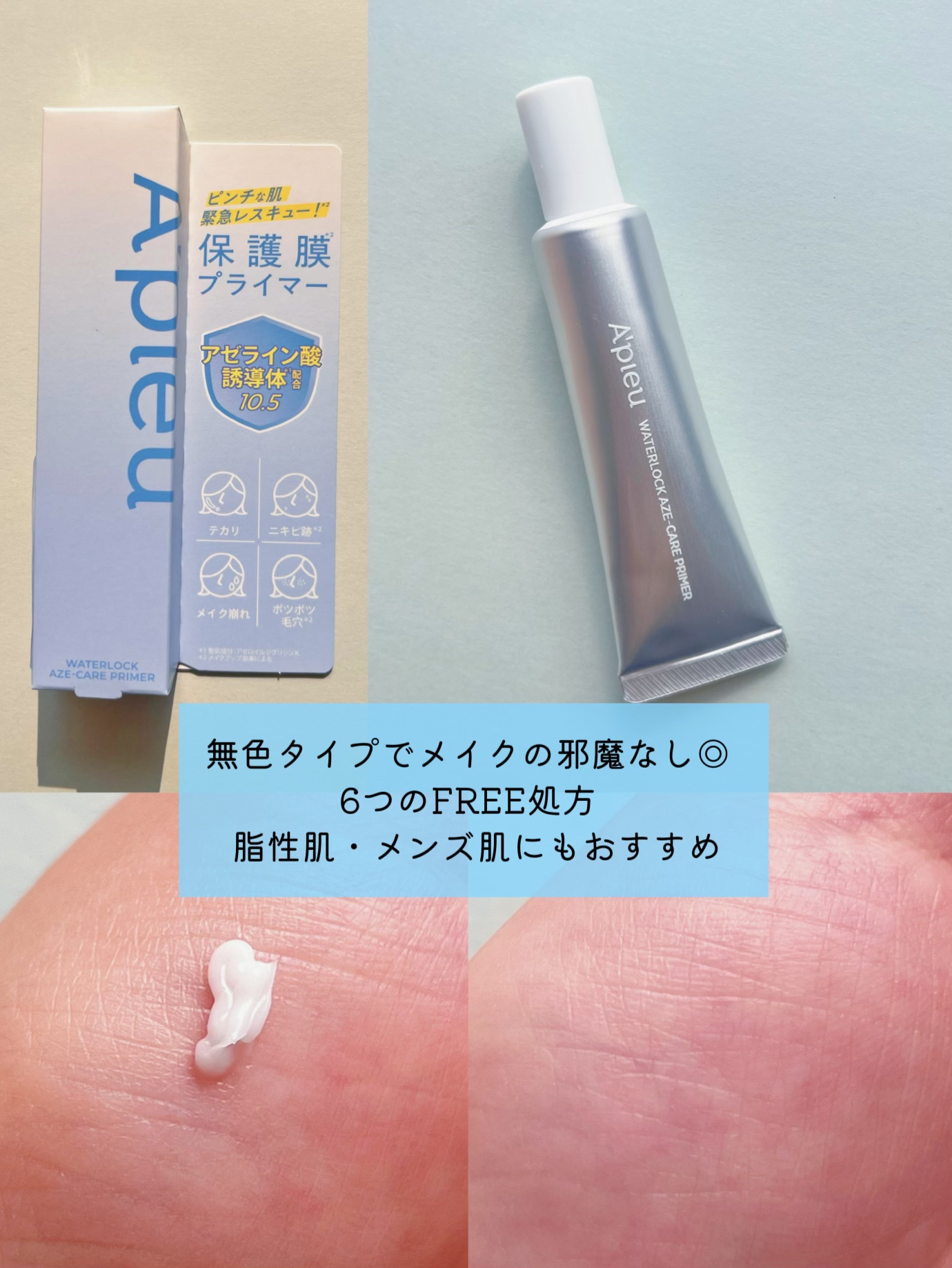 𝐀'𝐩𝐢𝐞𝐮ウォーターロックアゼケアプライマー話題のアゼライン酸誘導体*¹を10.5%配合したメイクアップベースが登場したよ𓂃◌𓈒𓐍気になる肌のテカリやベタつき、毛穴悩みにアプローチしてくれるのがアピューウォーターロックアゼケアプライマーこっ...