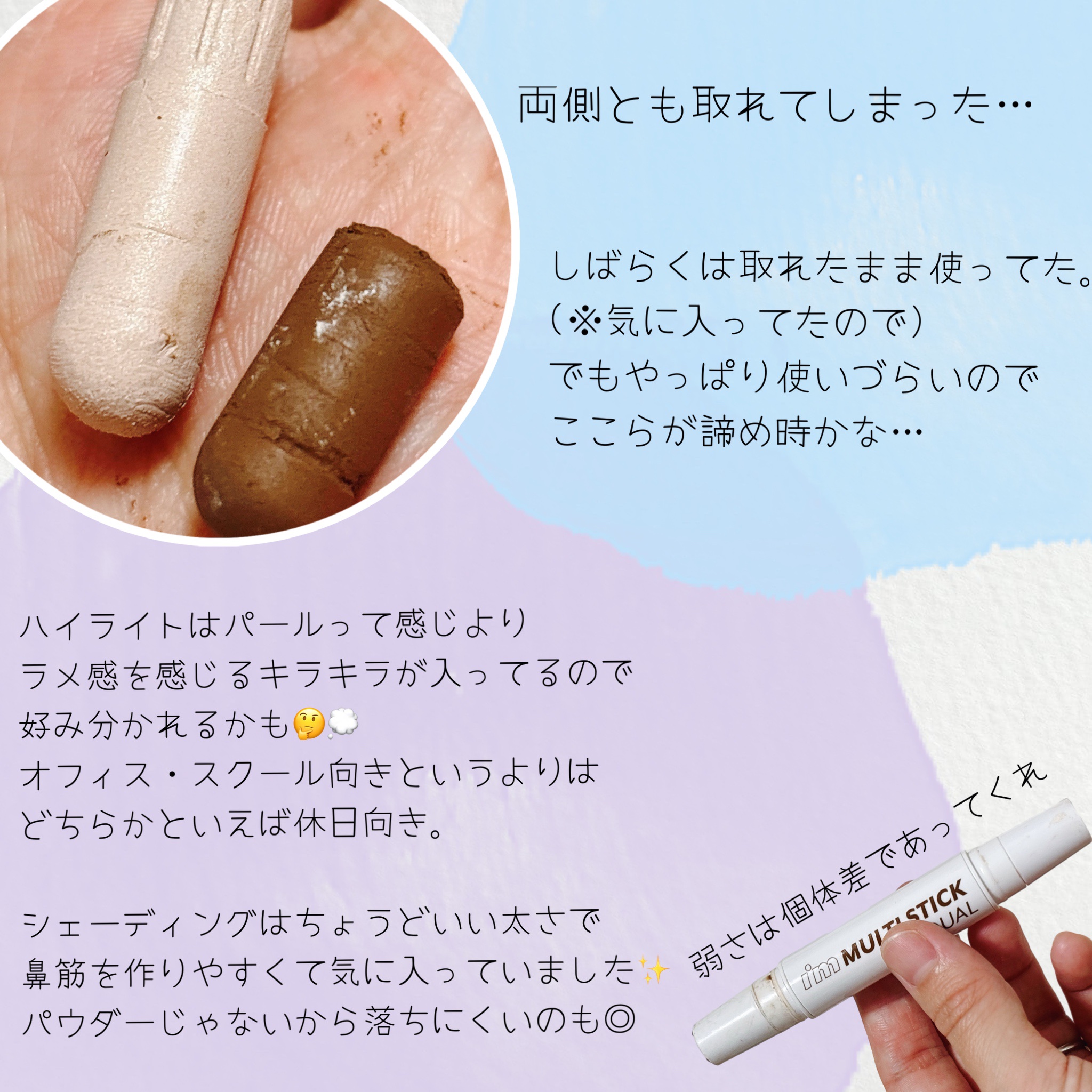 こーゆーの欲しかった!!めちゃくちゃ時短&小顔メイク✨💕店頭に置いてあった試供品を試して良さげだったので購入🙌アイムマルチスティックデュアルi’mmeme(アイムミミ)シェーディングとハイライターが1本になった、マルチスティック✨私は画像2の...