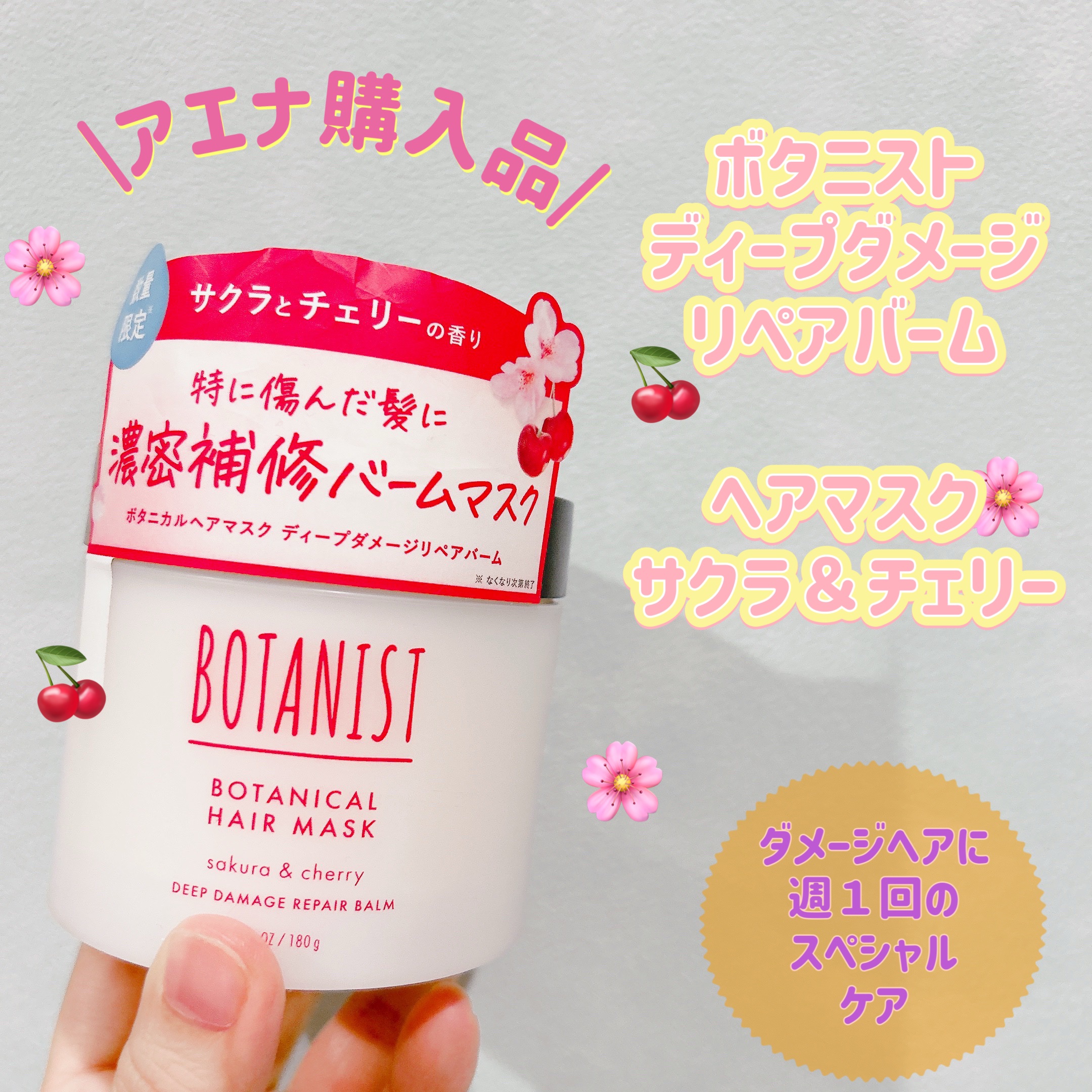 この香り大好き!BOTANISTボタニカルヘアマスクディープダメージリペアバームサクラ&チェリーの香りレビューBOTANISTのサクラ&チェリーの香りが大好きで、ボディソープを愛用していたのですがもうすぐでなくなりそう…ってところに、ドラッグ...