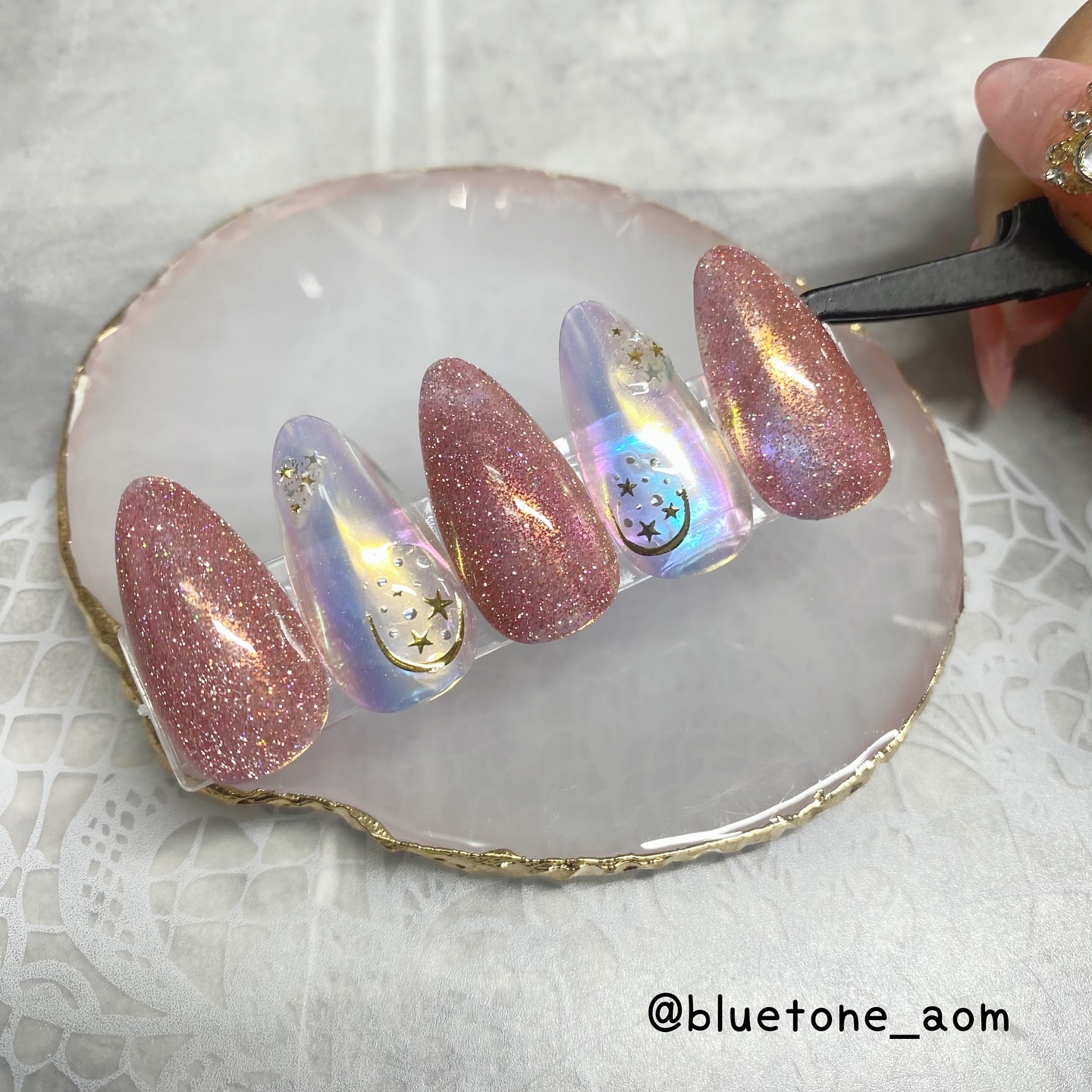 ラメがしっかりしてるし クリアカラーが入ってるから オーロラパウダー無しでも 充分キラキラしました! 反射強めのフィルムなので 実物はもっと うるうるとキラキラが強いです! ビー玉みたい🥺 ネイルシール長持ちさせたいけど ちょっと飽きてきたな〜って時とかに 全然違った印象になるのでオススメです! Seriaのベースジェル 本当にうるうるネイルしやすいので オススメしたい🙆♀️