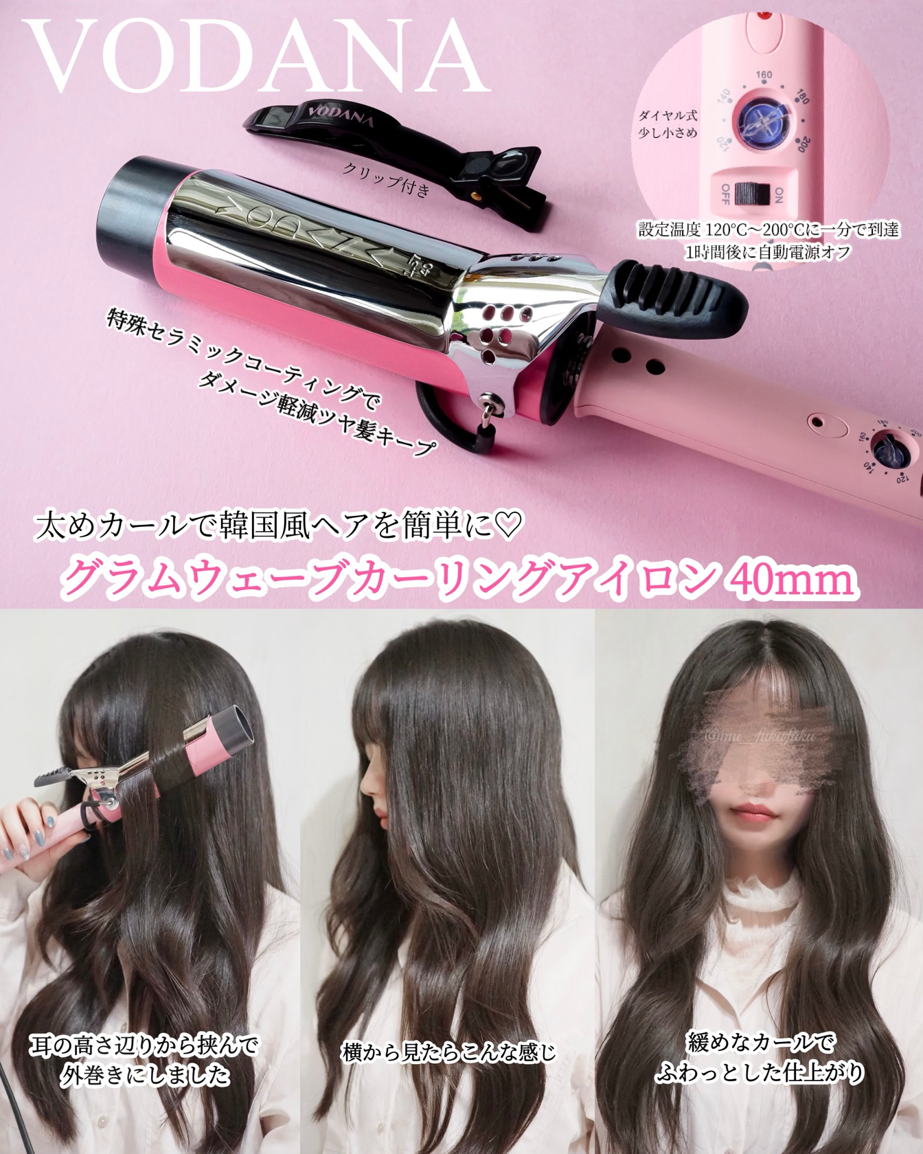 ボダナさまからグラムウェーブカーリングアイロン40mmをいただきました✨大きめの40mmサイズでゆるやかな巻き髪を作りたい時によかったです!やわらかい仕上がりでかわいい❤︎挟む部分の力がちょっとゆるめなのと少し短いのが気になったけど滑りはいい...