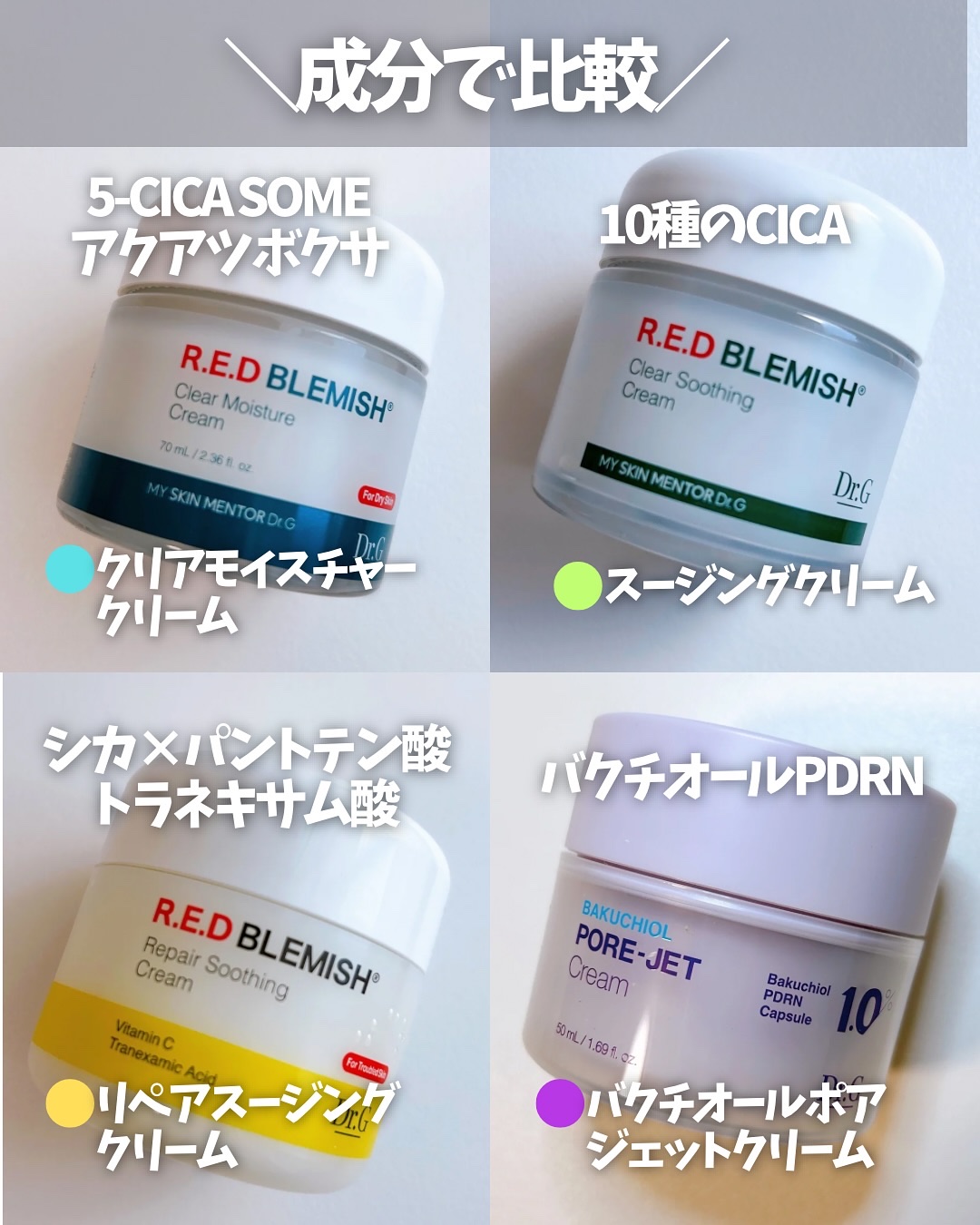 #PRDr.G▫️クリアスージングクリーム▫️クリアモイスチャークリーム▫️リペアスージングクリーム▫️バクチオールポアジェットクリーム皮膚科25年の技術を凝縮したDr.Gのクリーム🧐🌼人気のレッドブレミッシュシリーズのクリーム4種を比較して...