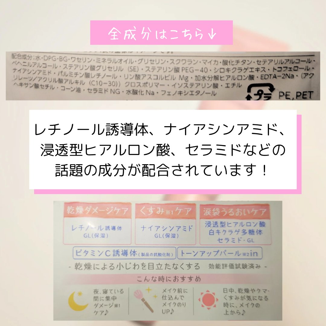 テクスチャーはこっくりしていますが、実際に塗ってみると伸びがいいので少量ですみます🙆🏻♀️ パールが配合されているので、塗るとキラキラしていてかなりトーンアップします✨ ナイアシンアミドやレチノールも配合されているので、保湿力もあり、日中のケアやメイクの乾燥にヨレを防げます‼️