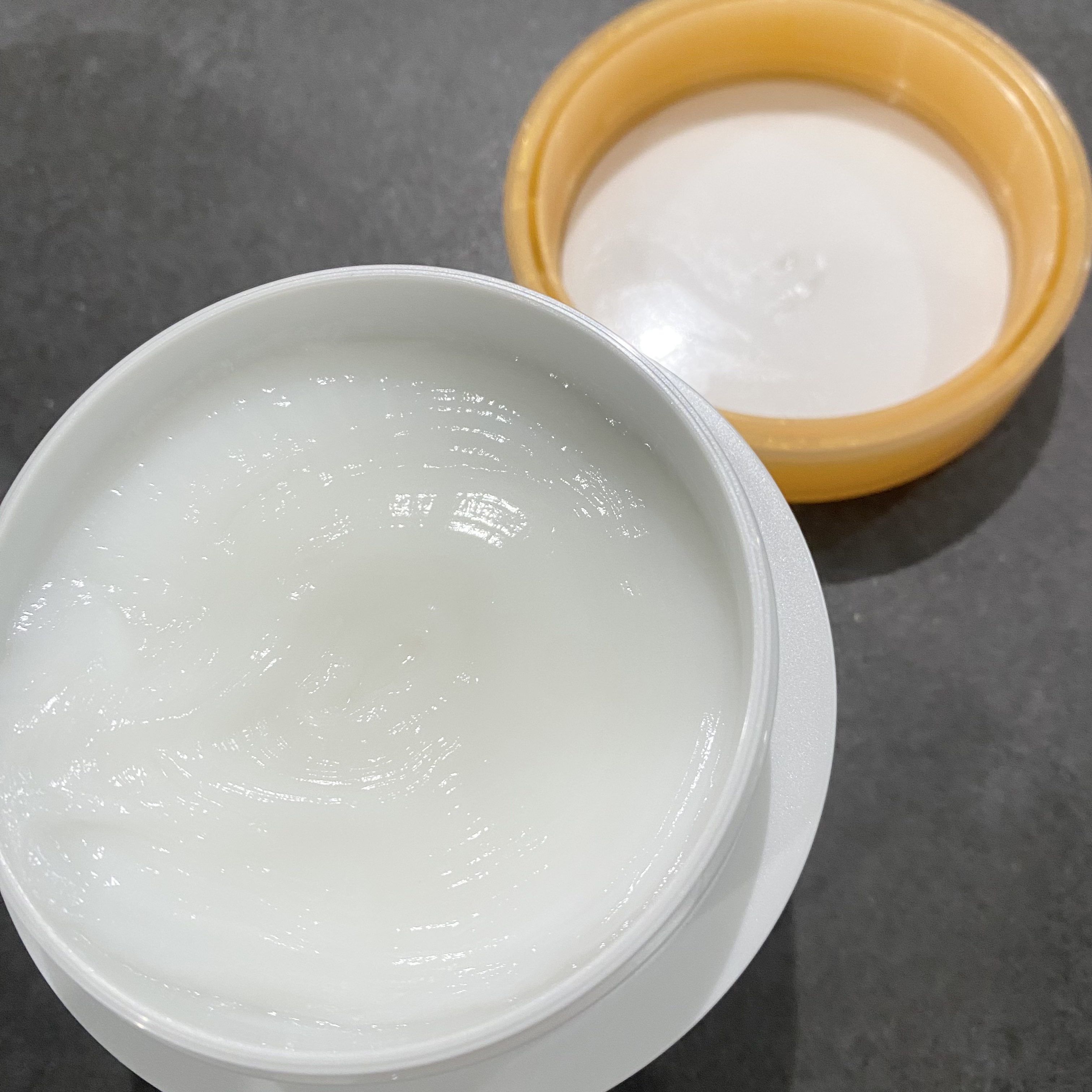 - <180g> 水、グリセリン、ステアリルアルコール、ジメチコン、ステアロキシプロピルジメチルアミン、乳酸、DPG、ヒマワリ種子油、ラノリン脂肪酸、ジラウラミドグルタミドリシンNa、γ-ドコサラクトン、ビスメトキシプロピルアミドイソドコサン、加水分解ケラチン(羊毛)、加水分解シルク、加水分解コラーゲン、加水分解コンキオリンタンパク、シア脂油、リンゴ酸、イソステアリルグリセリル、ポリグリセリン-3、スクワラン、ヒアルロン酸Na、ローヤルゼリーエキス、アモジメチコン、ビスセテアリルアモジメチコン、ラウレス-16、セテアレス-7、セテアレス-25、ポリクオタニウム-39、ポリアクリル酸、ポリアクリル酸Na、セバシン酸ジエチル、ベンジルアルコール、エタノール、BG、香料