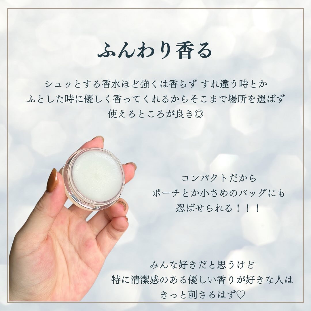 | 練り香水ランキング第8位 | 量の調節もしやすく、香りもふんわりと香ってくれるので強い香りが苦手な方にもオススメです🔆 | 詳細を見る | |