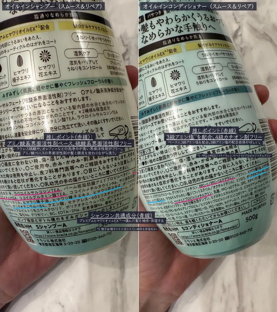 - <シャンプー 500g> 水、ラウロイルサルコシンTEA、パーム核脂肪酸アミドプロピルベタイン、コカミドメチルMEA、ココイルグルタミン酸TEA、ココイルメチルタウリンNa、ヤシ油脂肪酸PEG-7グリセリル、ヒマワリ種子油、ヒマワリ葉/茎エキス、ポリクオタニウム-64、ヒマワリ種子エキス、ヒマワリ花エキス、ポリクオタニウム-7、クエン酸、セテアレス-60ミリスチルグリコール、グアーヒドロキシプロピルトリモニウムクロリド、ポリクオタニウム-10、ココイルグルタミン酸2Na、ポリクオタニウム-49、エタノール、ココイルトレオニンNa、ココイルグルタミン酸Na、塩化Na、BG、グリセリン、EDTA-2Na、安息香酸Na、香料、カラメル <コンディショナー 500g> 水、ステアリルアルコール、グリセリン、ジメチコン、PPG-1/PEG-1ステアラミン、パラフィン、ヒマワリ種子油、ヒマワリ葉/茎エキス、ポリクオタニウム-64、ヒマワリ種子エキス、ヒマワリ花エキス、ヒマワリ芽エキス、ミツロウ、ネオペンタン酸イソデシル、ハチミツ、ポリクオタニウム-107、ビスジグリセリルポリアシルアジペート-2、ベヘナミドプロピルジメチルアミン、乳酸、DPG、グリコシルトレハロース、フェニルトリメチコン、加水分解水添デンプン、アモジメチコン、ヒドロキシエチルセルロース、(PEG-40/PPG-8メチルアミノプロピル/ヒドロキシプロピルジメチコン)コポリマー、(C12-14)パレス-7、(ジビニルジメチコン/ジメチコン)コポリマー、ラウレス-4、ラウレス-23、(C12-14)パレス-5、ステアリン酸PEG-55、PEG-160M、グルタミン酸、BG、エタノール、(C12,13)パレス-23、クエン酸、(C12,13)パレス-3、フェノキシエタノール、安息香酸Na、サリチル酸Na、メチルパラベン、香料、カラメル <シャンプー詰替用> 水、ラウロイルサルコシンTEA、パーム核脂肪酸アミドプロピルベタイン、コカミドメチルMEA、ココイルグルタミン酸TEA、ココイルメチルタウリンNa、ヤシ油脂肪酸PEG-7グリセリル、ヒマワリ種子油、ヒマワリ葉/茎エキス、ポリクオタニウム-64、ヒマワリ種子エキス、ヒマワリ花エキス、ポリクオタニウム-7、クエン酸、セテアレス-60ミリスチルグリコール、グアーヒドロキシプロピルトリモニウムクロリド、ポリクオタニウム-10、ココイルグルタミン酸2Na、ポリクオタニウム-49、エタノール、ココイルトレオニンNa、ココイルグルタミン酸Na、塩化Na、BG、グリセリン、EDTA-2Na、安息香酸Na、香料、カラメル <コンディショナー詰替用> 水、ステアリルアルコール、グリセリン、ジメチコン、PPG-1/PEG-1ステアラミン、パラフィン、ヒマワリ種子油、ヒマワリ葉/茎エキス、ポリクオタニウム-64、ヒマワリ種子エキス、ヒマワリ花エキス、ヒマワリ芽エキス、ミツロウ、ネオペンタン酸イソデシル、ハチミツ、ポリクオタニウム-107、ビスジグリセリルポリアシルアジペート-2、ベヘナミドプロピルジメチルアミン、乳酸、DPG、グリコシルトレハロース、フェニルトリメチコン、加水分解水添デンプン、アモジメチコン、ヒドロキシエチルセルロース、(PEG-40/PPG-8メチルアミノプロピル/ヒドロキシプロピルジメチコン)コポリマー、(C12-14)パレス-7、(ジビニルジメチコン/ジメチコン)コポリマー、ラウレス-4、ラウレス-23、(C12-14)パレス-5、ステアリン酸PEG-55、PEG-160M、グルタミン酸、BG、エタノール、(C12,13)パレス-23、クエン酸、(C12,13)パレス-3、フェノキシエタノール、安息香酸Na、サリチル酸Na、メチルパラベン、香料、カラメル <シャンプー詰替用(430ml)> 水、ラウロイルサルコシンTEA、パーム核脂肪酸アミドプロピルベタイン、コカミドメチルMEA、ココイルグルタミン酸TEA、ココイルメチルタウリンNa、ヤシ油脂肪酸PEG-7グリセリル、ヒマワリ種子油、ヒマワリ種子エキス、ヒマワリ花エキス、ポリクオタニウム-7、ポリクオタニウム-64、クエン酸、セテアレス-60ミリスチルグリコール、グアーヒドロキシプロピルトリモニウムクロリド、ポリクオタニウム-10、ポリクオタニウム-49、エタノール、塩化Na、グリセリン、BG、EDTA-2Na、安息香酸Na、香料、カラメル <コンディショナー詰替用 増量(430g)> 水、ステアリルアルコール、グリセリン、ジメチコン、PPG-1/PEG-1ステアラミン、パラフィン、ヒマワリ種子油、ヒマワリ葉/茎エキス、ポリクオタニウム-64、ヒマワリ種子エキス、ヒマワリ花エキス、ヒマワリ芽エキス、ミツロウ、ネオペンタン酸イソデシル、ハチミツ、ポリクオタニウム-107、ビスジグリセリルポリアシルアジペート-2、ベヘナミドプロピルジメチルアミン、乳酸、DPG、グリコシルトレハロース、フェニルトリメチコン、加水分解水添デンプン、アモジメチコン、ヒドロキシエチルセルロース、(PEG-40/PPG-8メチルアミノプロピル/ヒドロキシプロピルジメチコン)コポリマー、(C12-14)パレス-7、(ジビニルジメチコン/ジメチコン)コポリマー、ラウレス-4、ラウレス-23、(C12-14)パレス-5、ステアリン酸PEG-55、PEG-160M、グルタミン酸、BG、エタノール、(C12,13)パレス-23、クエン酸、(C12,13)パレス-3、フェノキシエタノール、