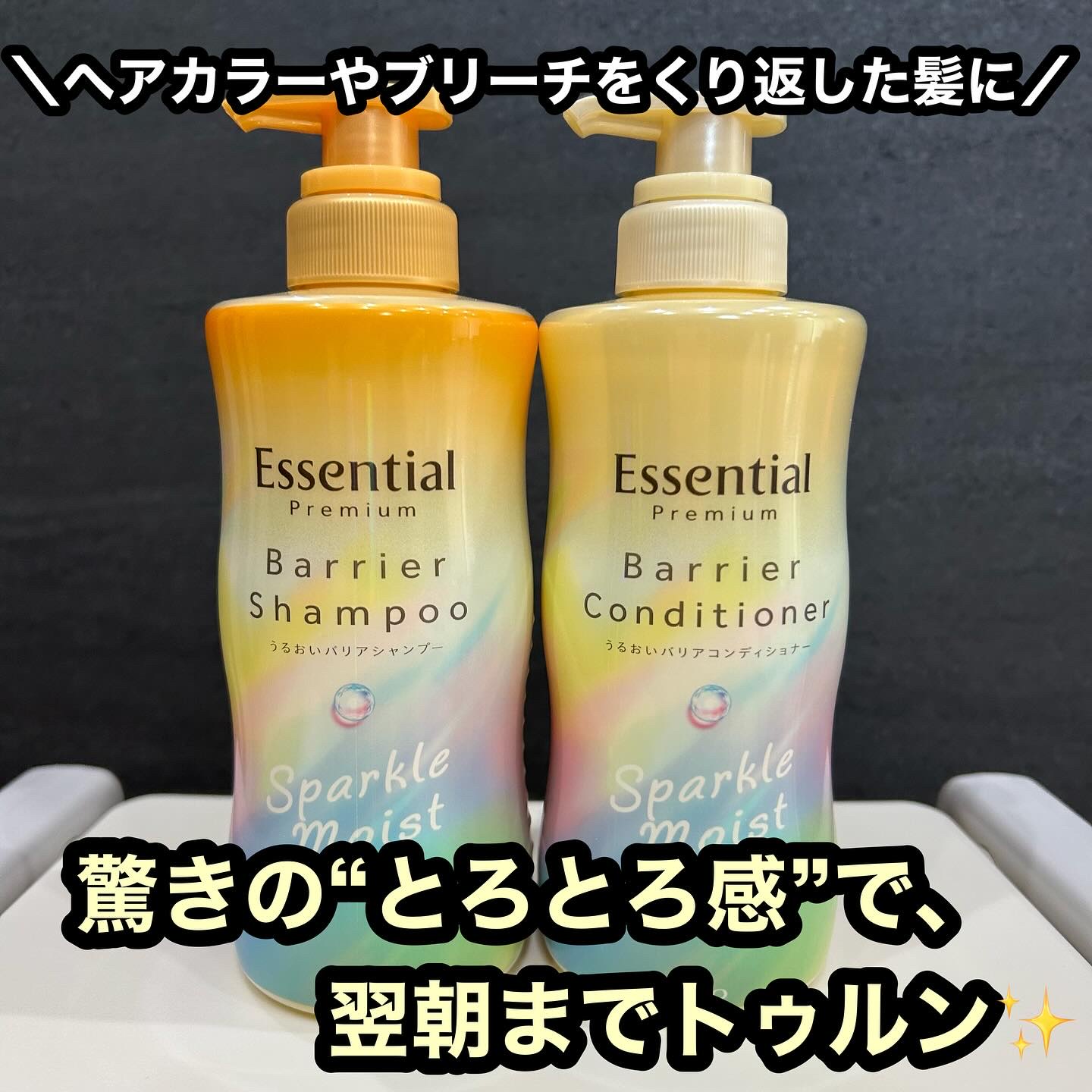 エッセンシャルプレミアムバリアシャンプー・コンディショナースパークルモイスト♡ハイダメージ髪向けのアイテム✨洗い流した瞬間から、驚きのとろとろ感。カラーやブリーチで傷んだ髪内部を補修して、うるおいで満たしてくれるそう。シャンプーは泡立ち良く、...
