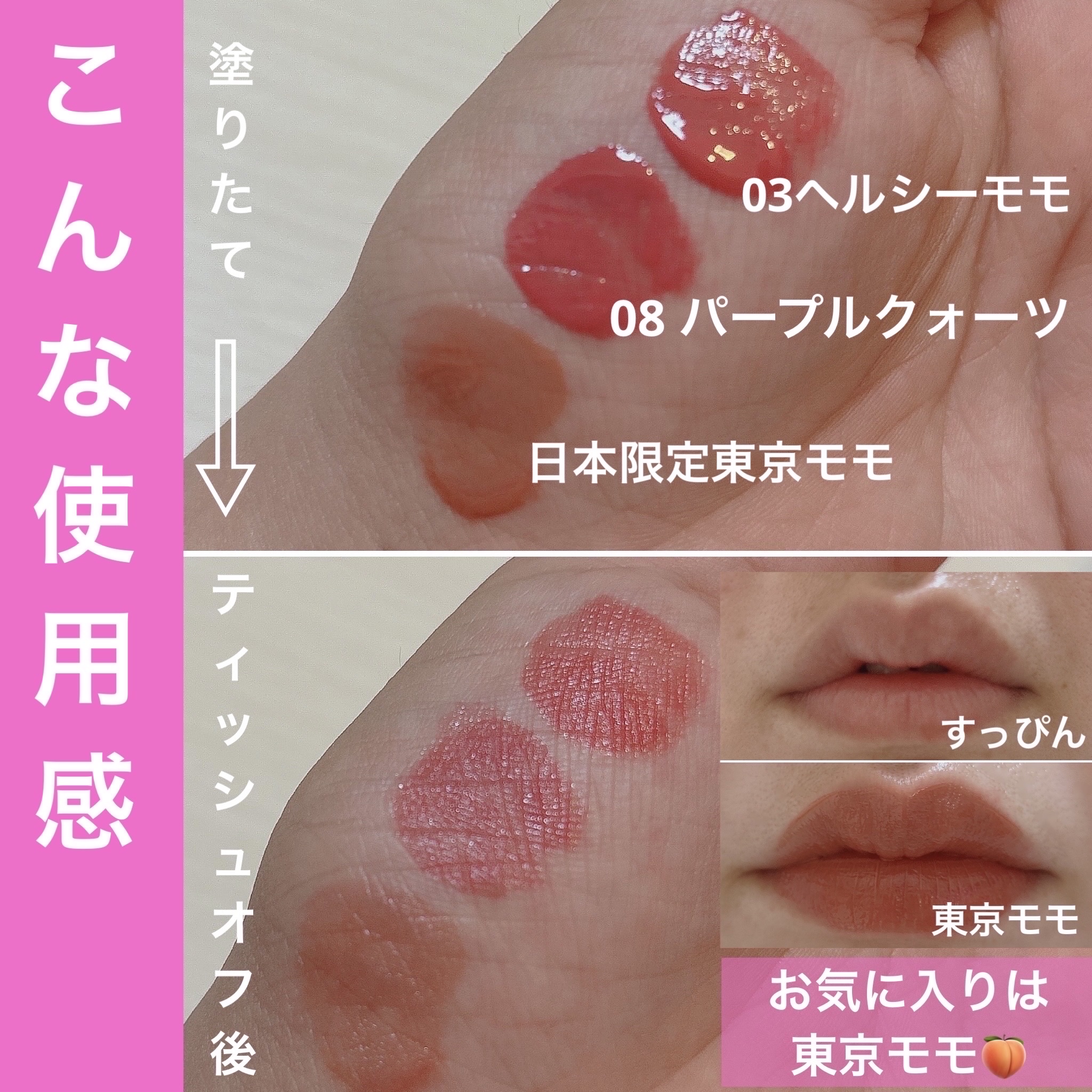 - <01 ラヴィアンコーラル> 精製水、ジフェニルジメチコン、リンゴ酸ジイソステアリル、ビスジグリセリルポリアシルアジペート-2、水添ポリイソブテン、ジグリセリン、セチルPEG/PPG-10/1ダイメチコン、DPG、イソステアリン酸ソルビタン、ポリソルベート60、オクチルドデカノール、ペンチレングリコール、グリセリン、二酸化チタン、セテアレス-20、アクリル酸ヒドロキシエチル/ナトリウムアクリロイルジメチルタウリン酸共重合体フェノキシエタノール、スクアラン、ポリグリセリン-3、香料、ステビオシド、黄色4号、エチルヘキシルグリセリン、赤色227号、トリ(カプリル/カプリン酸)グリセリル、赤色104号(1)、トコフェリルアセテート、黄色5 号、ブリリアントブルーFCF、マンゴー果実エキス、リンゴエキス <06 フィグデュー> 水、ジフェニルジメチコン、リンゴ酸ジイソステアリル、ポリアシルアジピン酸ビス-ジグリセリル-2、水添ポリイソブテン、ジグリセリン、セチルPEG/PPG-10/1ジメチコン、ジプロピレングリコール、イソステアリン酸ソルビタン、ポリソルベート60、オクチルドデカノール、ペンチレングリコール、グリセリン、二酸化チタン(CI) 77891)、セテアレス-20、アクリル酸ヒドロキシエチル/アクリロイルジメチルタウリンナトリウムコポリマー、スクワラン、フェノキシエタノール、ポリグリセリン-3、香料、ステビオシド、赤28(CI 45410)、黄6(CI 15985)、黄5(CI 19140)、エチルヘキシルグリセリン、レッド 33 (CI 17200)、カプリル酸/カプリン酸トリグリセリド、酢酸トコフェロール、ブルー 1 (CI 42090)、Mangifera Indica (マンゴー) 果実エキス、Pyrus Malus (リンゴ) 果実エキス <12 日曜日> 水、ジフェニルジメチコン、リンゴ酸ジイソステアリル、ビスジグリセリルポリアシルアジペート-2、水添ポリイソブテン、ジグリセリン、セチルPEG/PPG-10/1ジメチコン、DPG、イソステアリン酸ソルビタン、ポリソルベート60、オクチルドデカノール、ペンチレングリコール、グリセリン、セテアレス-20、(アクリル酸ヒドロキシエチル/アクリロイルジメチルタウリンNa)コポリマー、フェノキシエタノール、スクワラン、ポリグリセリン-3、ステビオシド、香料、エチルヘキシルグリセリン、トリ(カプリル酸/カプリン酸)グリセリル、酢酸トコフェロール、マンゴー果実エキス、リンゴ果実エキス、酸化チタン、酸化鉄、黄4、赤227、赤104(1)、黄5、青1 <【旧】02 漢江ブリーズ> 水、ジフェニルジメチコン、リンゴ酸ジイソステアリル、ポリアシルアジピン酸ビス-ジグリセリル-2、水添ポリイソブテン、ジグリセリン、セチルPEG/PPG-10/1ジメチコン、ジプロピレングリコール、イソステアリン酸ソルビタン、ポリソルベート60、オクチルドデカノール、ペンチレングリコール、グリセリン、二酸化チタン(CI) 77891)、セテアレス-20、アクリル酸ヒドロキシエチル/アクリロイルジメチルタウリンナトリウムコポリマー、フェノキシエタノール、スクワラン、イエロー6 (CI 15985)、ポリグリセリン-3、香料、ステビオシド、エチルヘキシルグリセリン、レッド33 (CI 17200)、レッド28 (CI 45410)、トリカプリル/カプリン酸グリセリド、酢酸トコフェロール、ブルー 1 (CI 42090)、Mangifera Indica (マンゴー) 果実エキス、Pyrus Malus (リンゴ) 果実エキス <【旧】05 ヒップジロー> 水、ジフェニルジメチコン、リンゴ酸ジイソステアリル、ポリアシルアジピン酸ビス-ジグリセリル-2、水添ポリイソブテン、ジグリセリン、セチルPEG/PPG-10/1ジメチコン、ジプロピレングリコール、イソステアリン酸ソルビタン、ポリソルベート60、オクチルドデカノール、ペンチレングリコール、グリセリン、二酸化チタン(CI) 77891)、セテアレス-20、アクリル酸ヒドロキシエチル/アクリロイルジメチルタウリンナトリウムコポリマー、スクワラン、フェノキシエタノール、イエロー6 (CI 15985)、ポリグリセリン-3、香料、ステビオシド、エチルヘキシルグリセリン、レッド33 (CI 17200)、カプリル酸/カプリン酸トリグリセリド、酢酸トコフェロール、ブルー 1 (CI 42090)、Mangifera Indica (マンゴー) 果実エキス、Pyrus Malus (リンゴ) 果実エキス <【旧】09 ソウル ソウル> 水、ジフェニルジメチコン、マレートジソステアル、ビスジグリセリルポリシルダイピン-2、水素化ポリイソブテン、ディグリセリン、セチルペグ/PPG-10/1ジメチコン、ジップロピレングリコール、ソルビトン等酸塩、ポリソルベ酸60、オクティロドデドカン、ペンシェルン、ペントリン酸塩、ペントリ酸塩、ペンシュレン 二酸化チタン (CI 77891)、アクリル酸ヒドロキシエチル/アクリロイルジメチルタウリン酸ナトリウムコポリマー、フェノキシエタノール、スクワラン、イエロー6 (CI 15985)、ポリグリセリン-3、香料、ステビオシド、エチルヘキシルグリセリン、レッド33 (CI 17200)、カプリル酸/カプリン酸トリグリセリド、酢酸トコフェロール、ブルー 1 (CI 42090)、Mangifera Indica (マンゴー) 果実エキス、Pyrus Malus (リンゴ) 果実エキス <【旧】10 朝イチジク> 水、ジフェニルジメ