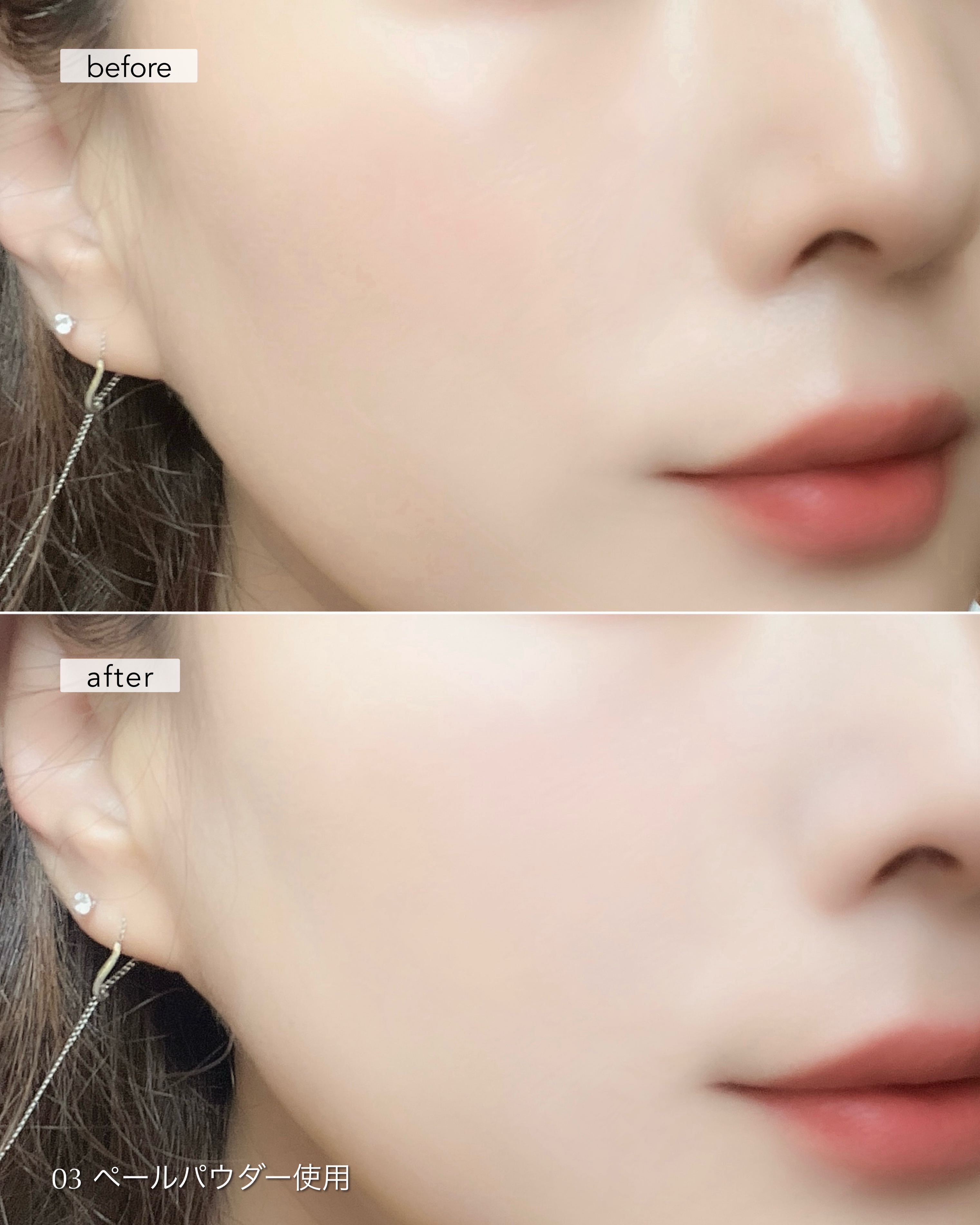 - <01 クリーンパウダー> タルク、ポリメチルシルセスキオキサン、ジフェニルシロキシフェニルトリメチコン、ナイロン-12、合成ミツロウ、ミリスチン酸Mg、(ジメチコン/ビニルジメチコン)クロスポリマー、カプリリルグリコール、エチルヘキシルグリセリン、ジメチコン、シリカ、トリエトキシカプリリルシラン、トコフェロール、酸化鉄 <02ブラーパウダー> マイカ(CI 77019)、タルク、エチルヘキシルメトキシシンナメート、ナイロン-12、シリカ、二酸化チタン(CI 77891)、エチレン/アクリル酸共重合体、酸化亜鉛(CI 77947)、メチレンビス-ベンゾトリアゾリルテトラメチルブチルフェノール、ミリスチン酸マグネシウム、ジメチコン/ビニルジメチコンクロスポリマー、フェニルトリメチコン、トリメチロールプロパントリエチルヘキサノエート、水酸化アルミニウム、ジメチコン、カプリリルグリコール、エチルヘキシルグリセリン、ヒドロゲネチドレシチン、ジメチコン/メチコン共重合体、メチコン、トリエトキシカプリリルシラン、ウルトラマリン(CI 77007)、黄色酸化鉄(CI 77492)、赤色酸化鉄(CI 77491)、シトロネロール、リナロール