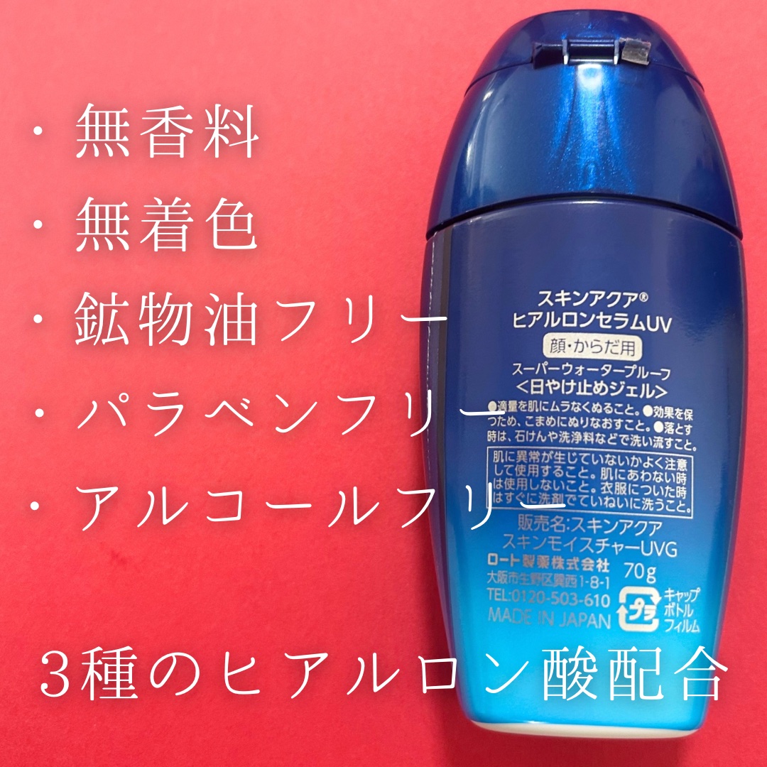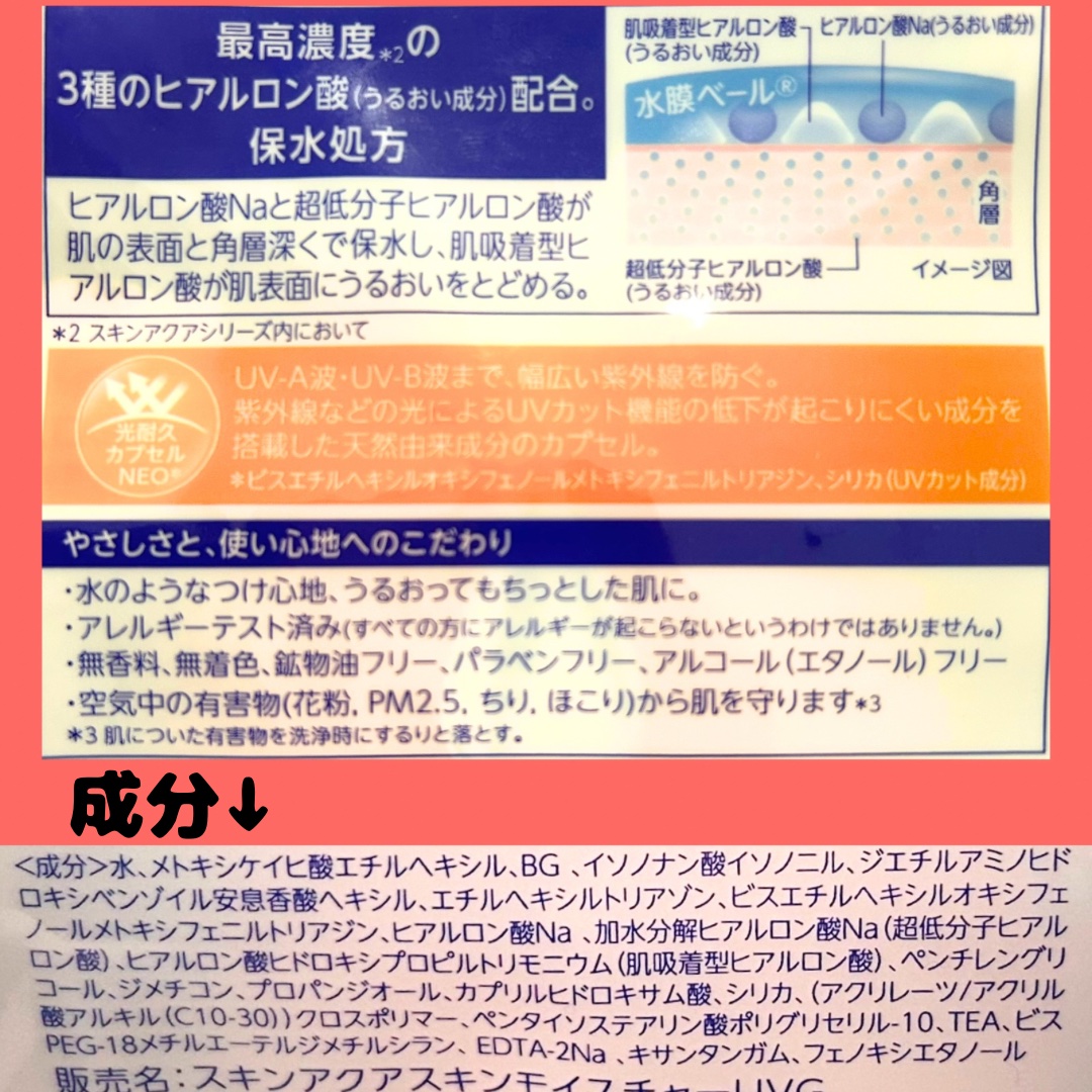 - エタノールフリーで心地よい使用感を実現。最高濃度※1の3種のヒアルロン酸※2配合。 水のようなつけ心地でうるおってもちっとした肌に。 使いやすいワンタッチキャップ。 SPF50+/PA++++/UV耐水性★★。 ※1:スキンアクアシリーズ内において ※2:うるおい成分:ヒアルロン酸Na、超低分子ヒアルロン酸(加水分解ヒアルロン酸Na)、肌吸着型ヒアルロン酸(ヒアルロン酸ヒドロキシプロピルトリモニウム)