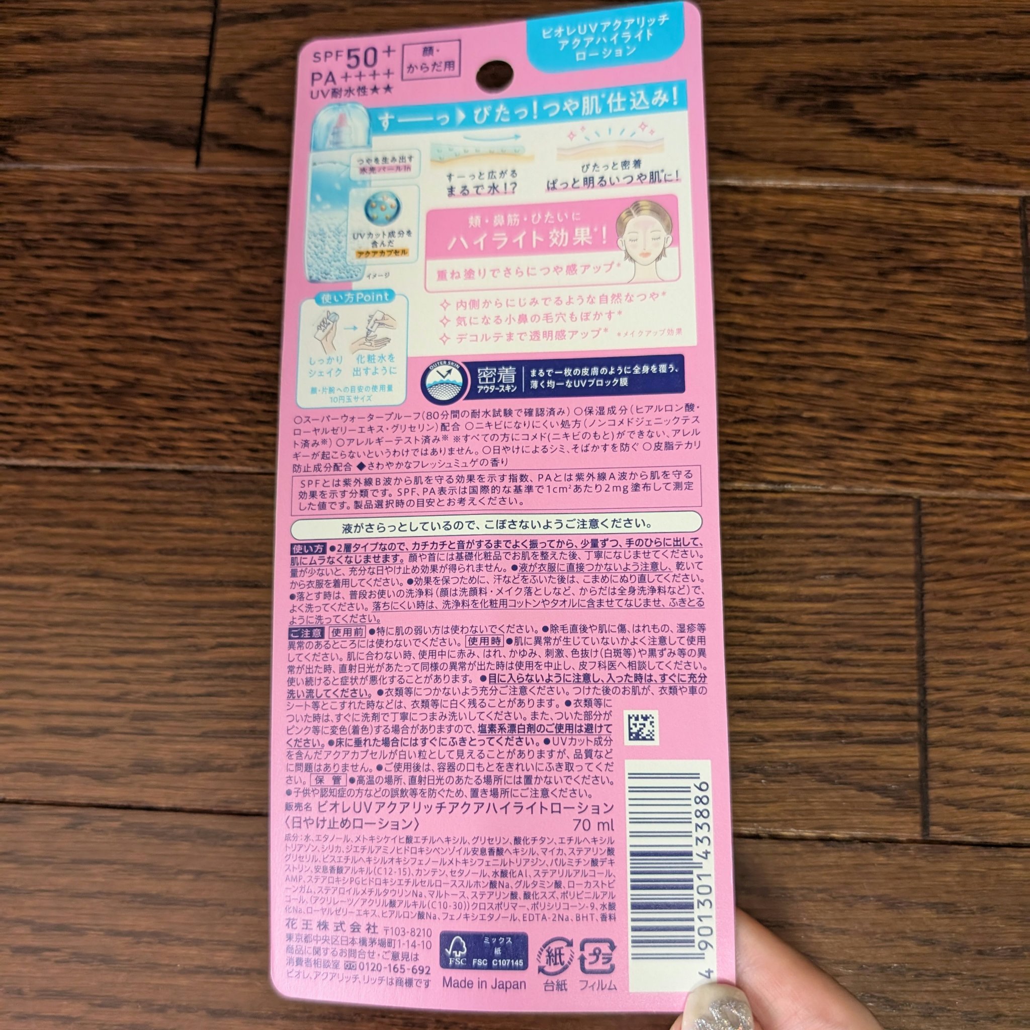 .ビオレUVアクアリッチアクアハイライトローション🌸#水層ハイライトuv身体用に購入🙌シャバシャバ系の日焼け止め。ジェルタイプに慣れてた私としてはやや使いづらい笑でも微粒のパールがすごくて、ほんとにキラキラつや感がアップ。頰、鼻筋やひたいに使...
