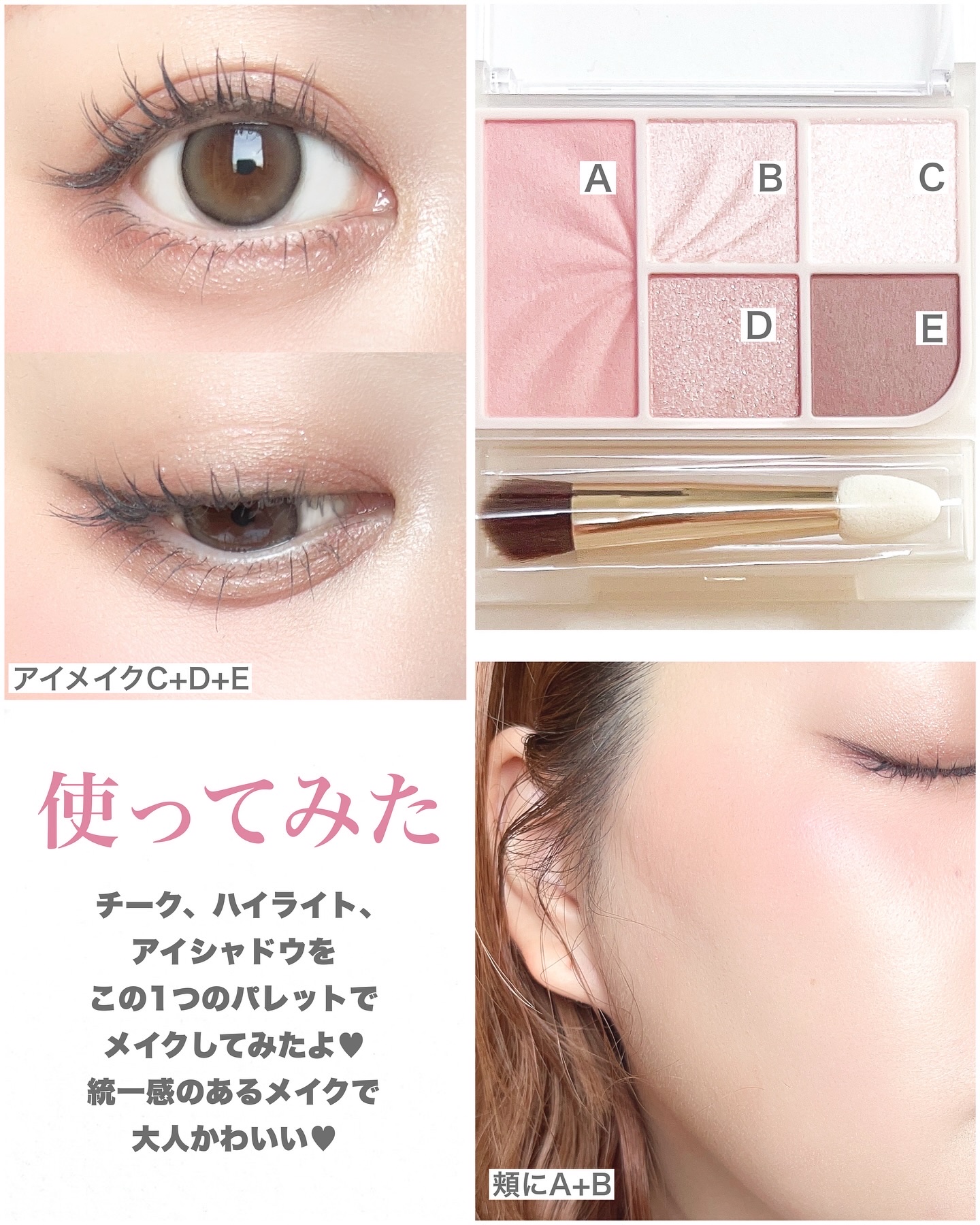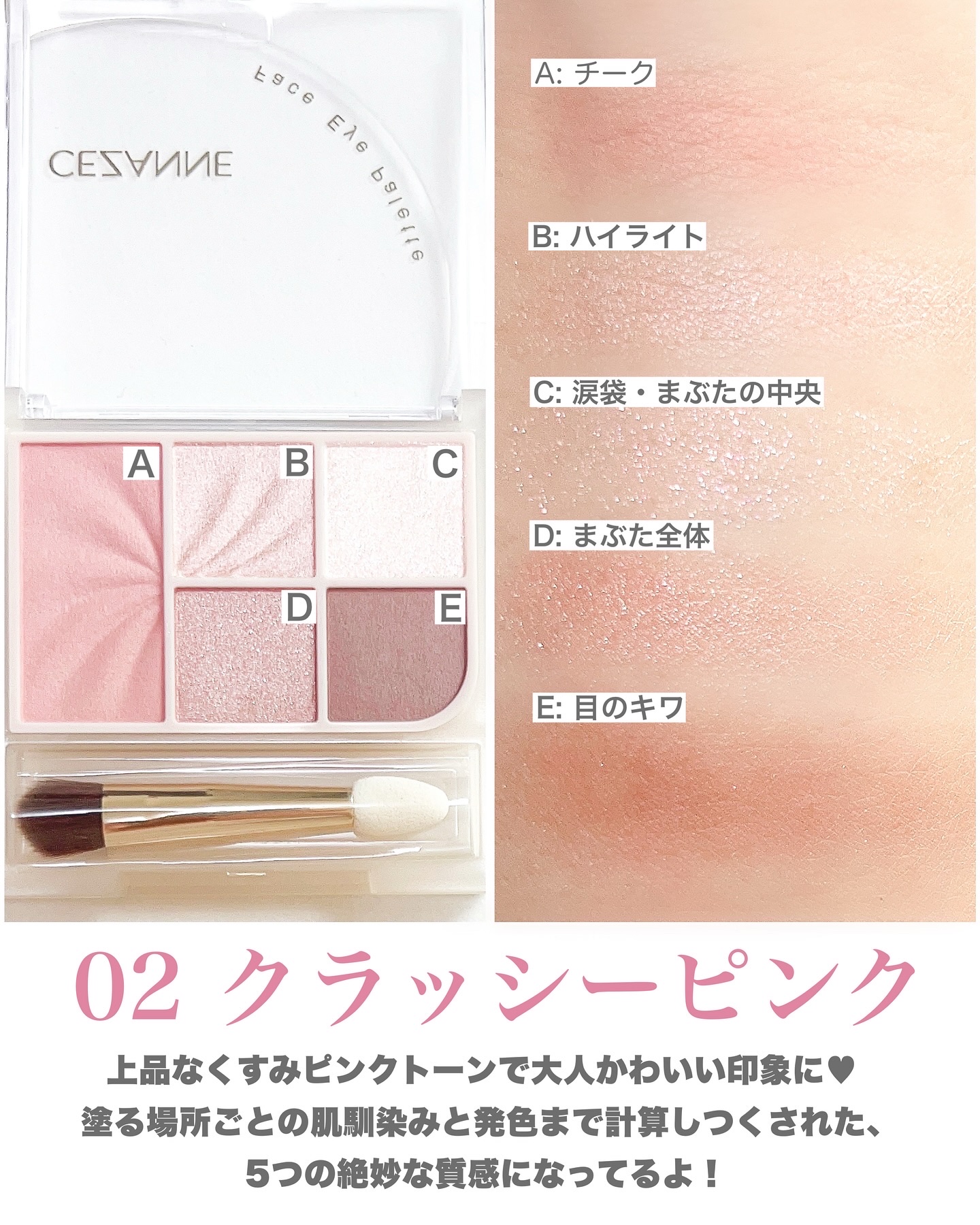 - 頬&目元のメイクが1つで完成するパレット。 チーク・ハイライト・アイシャドウが1つのパレットにin! 使いやすい”カラー×質感”で誰でも簡単にメイク完成♪ 自然な奥行を作りやすいトーンを揃えた濃淡カラー。頬と目元の色味を合わせて統一感アップ! 発色や仕上がりが絶妙に異なる5質感パウダー。しっとりした粉質でくすみにくく、メリハリ立体感を演出! チップ・ブラシ付。 (ふんわり色づく毛量たっぷりミニブラシ・しっかり色づく肌当たり柔らかなチップ) 01 ピュアコーラル:柔らかいコーラルベージュのウォームトーン。温かみのある優しい印象に。 02 クラッシーピンク:上品なくすみピンクのクールトーン。大人っぽくて可愛い印象に。