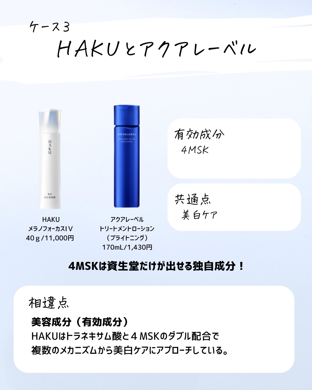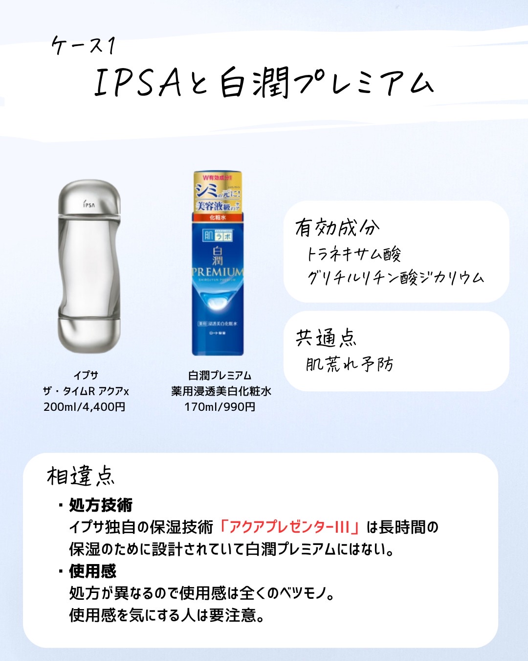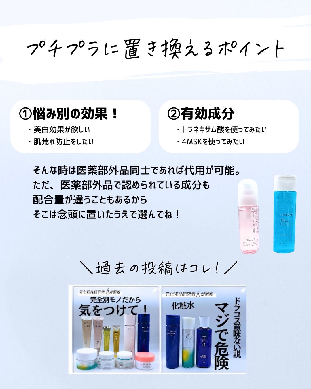 特定の有効成分を試してみたい。美容成分を試したい。そんな時は代用してもいいけど、それって似てるのかな?って思うときが正直ある。 同じ成分があっても実は濃度が違ったり、処方技術が違ったり。技術が違うと使用感も剤型も変わることがあることは知ったうえで使うといいかも。 せっかくプチプラ化粧品を買うならそれはそれで楽しんでほしいから是非念頭にいれてほしいな!!