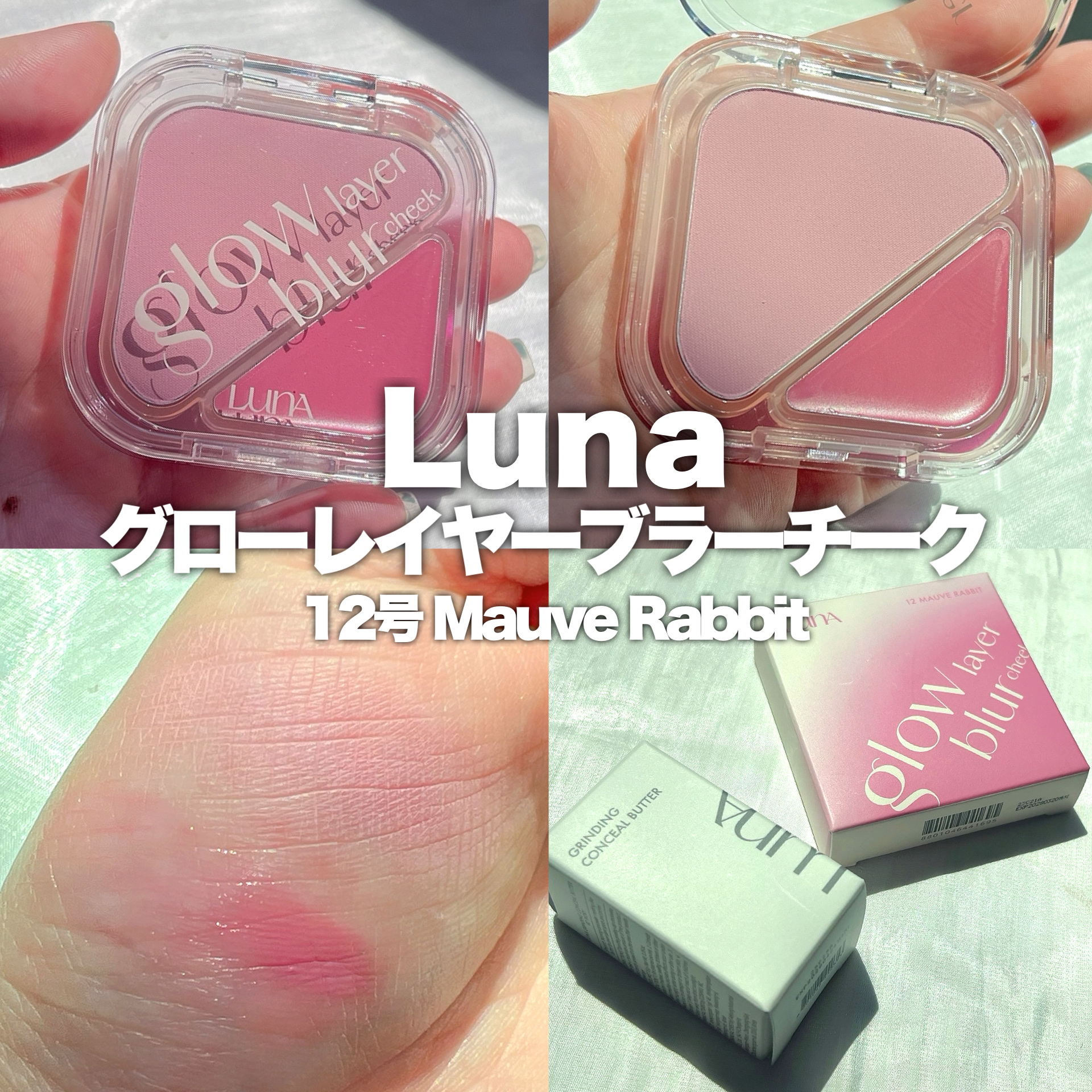 LUNAの[GRINDINGCONCEALBUTTER02IVORY&GLOWLAYERBLURCHEEK12MAUVERABBIT]をご紹介🐰💗コンシーラーは回すと出てきて使う分だけ出てくる!なめらかなテクスチャーでピタっと密着。カバー力あ...