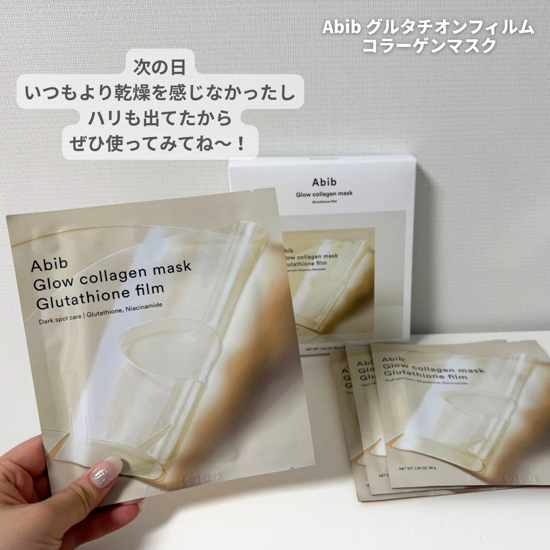 Abib(アビブ)の新作「グルタチオンフィルムコラーゲンマスク」を使ってみた🥹💓最近流行りのゲルマスク!つけてみたらヒヤッとして気持ちよかった✨付けた後はクリーム塗ったんだけど、いつもより透明感出てハリがある感じがした。【商品の特徴】・高純度...